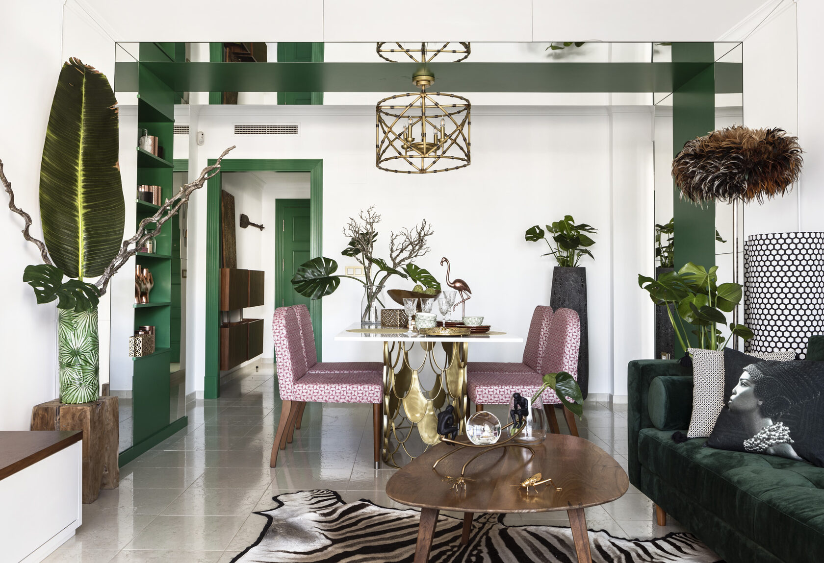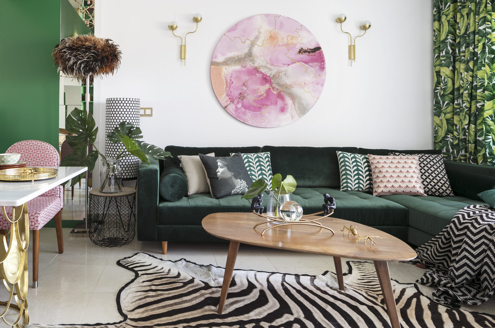 Nadezhda Chak embraced the tropical decorative theme with unwavering commitment. Wallpaper adorned with oversized leaves graces the walls, complemented by curtains featuring the same motif on the windows. A chandelier crafted to resemble bamboo (though actually made of brass), a zebra skin, a flamingo statuette, and a feathered floor lamp collectively transform the apartment into a lush jungle-like retreat, perfect for seaside relaxation. Importantly, the project’s author maintained a keen sense of proportion throughout.