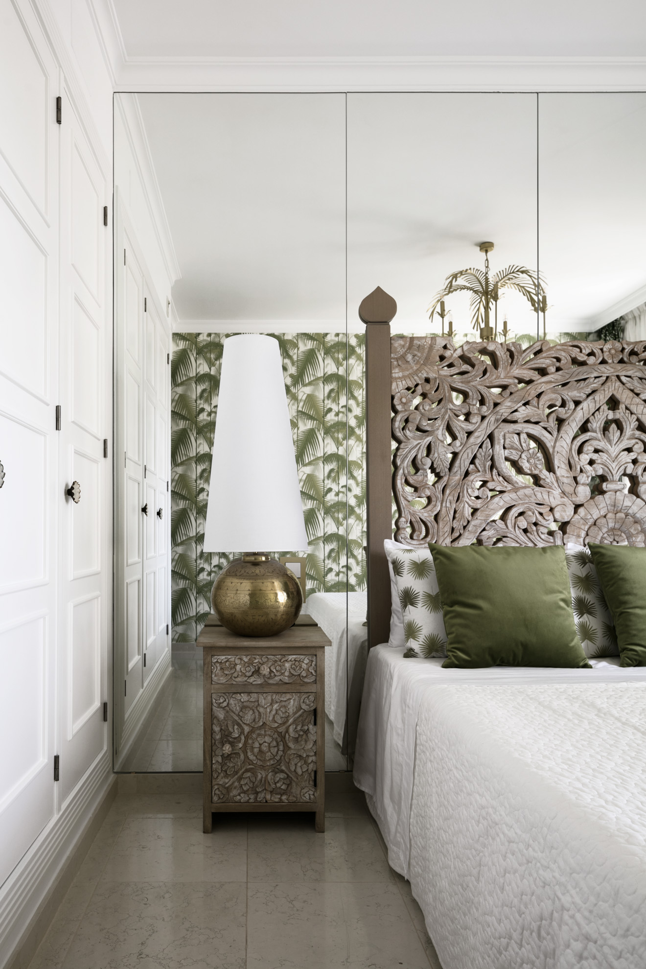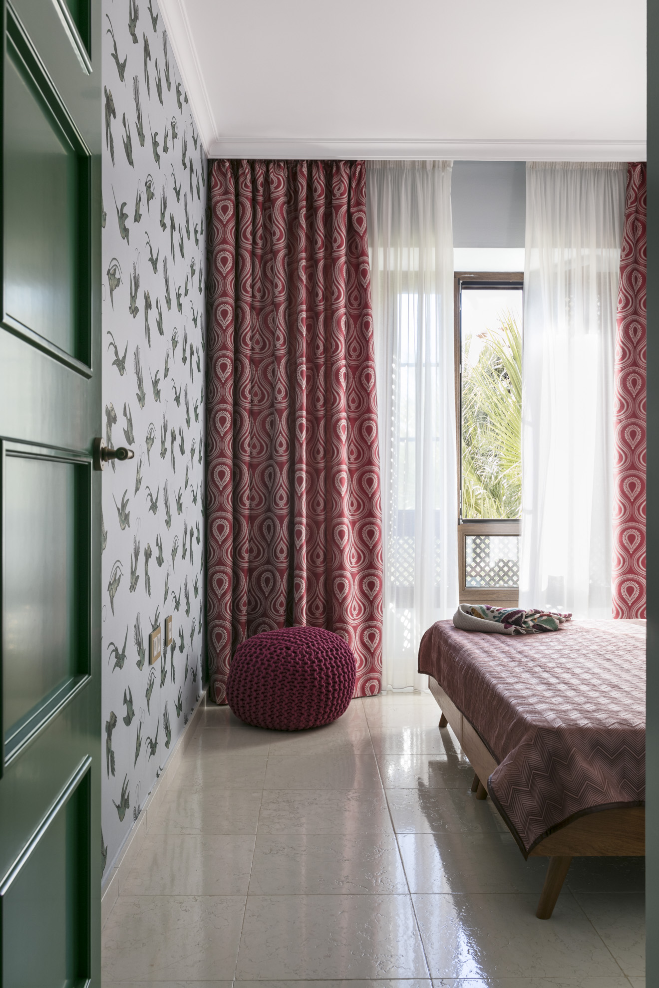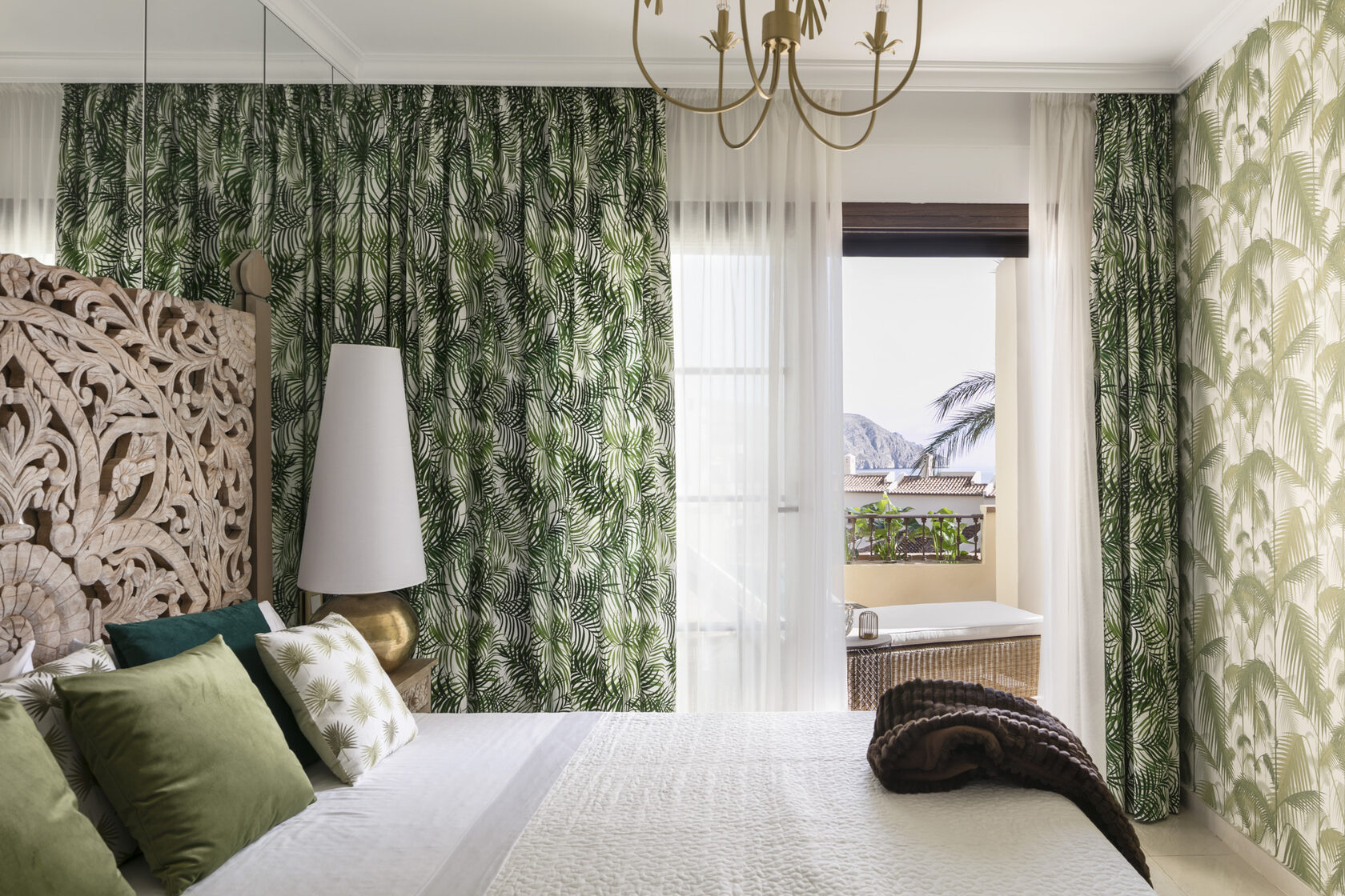 The predominant colour scheme revolves around green, complemented by touches of pink. This combination truly defines the interior. However, in reality, white features prominently throughout the space. The crisp white backdrop effectively enhances the vibrancy of the colours, while the Spanish sun adds its own magic. Green was also selected for the bedroom, albeit in a tranquil, visually pleasing natural hue. The same pattern is subtly presented in various shades on both the curtains and wallpaper, creating a harmonious ambiance.