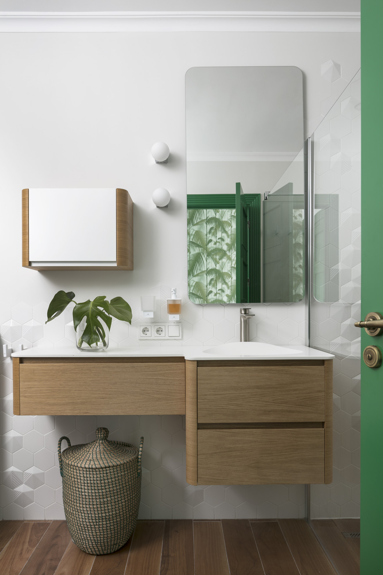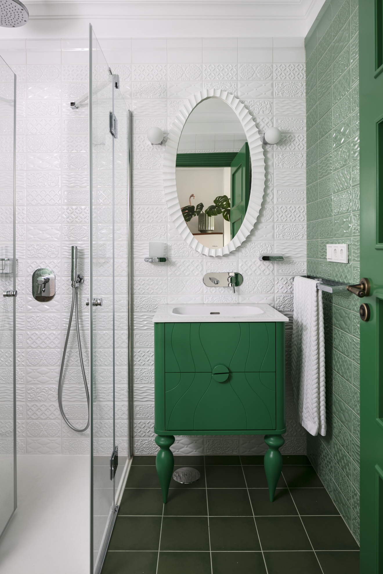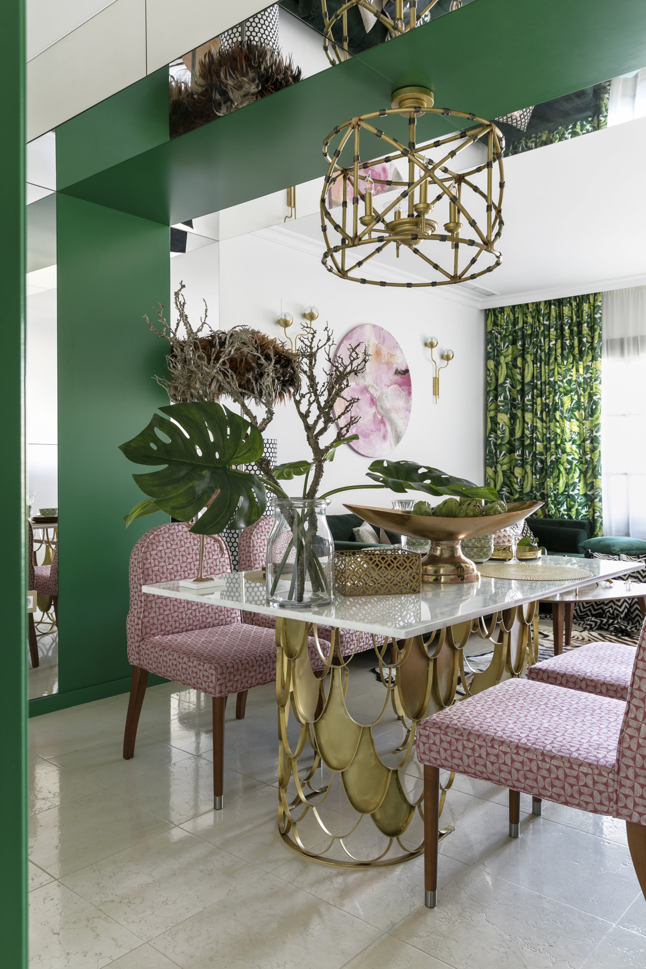 The predominant colour scheme revolves around green, complemented by touches of pink. This combination truly defines the interior. However, in reality, white features prominently throughout the space. The crisp white backdrop effectively enhances the vibrancy of the colours, while the Spanish sun adds its own magic. Green was also selected for the bedroom, albeit in a tranquil, visually pleasing natural hue. The same pattern is subtly presented in various shades on both the curtains and wallpaper, creating a harmonious ambiance.