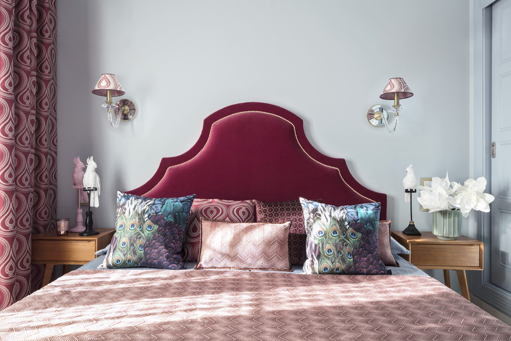 Custom-made with the same fabric as the curtains, featuring an inverted pattern for a cohesive and stylish touch