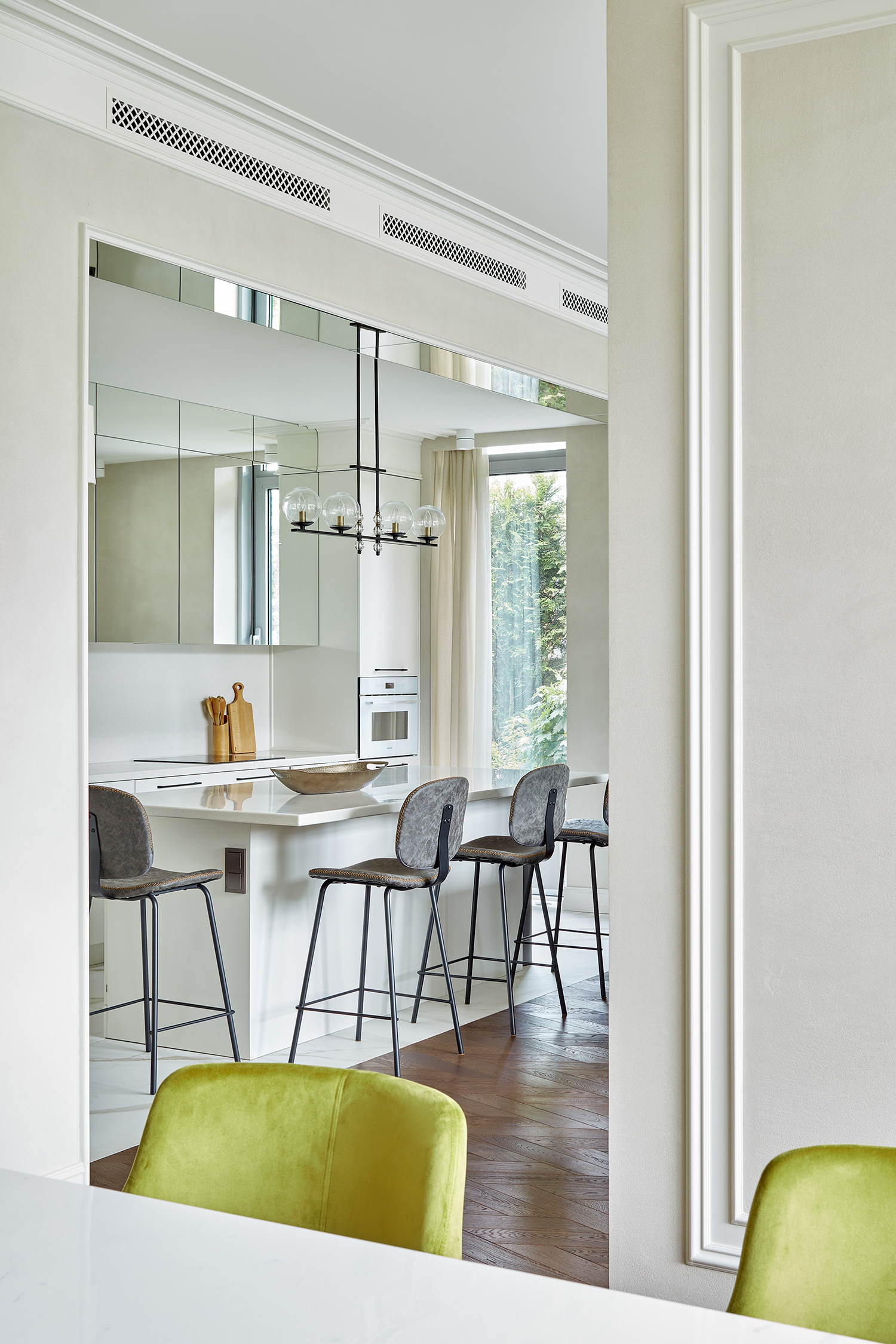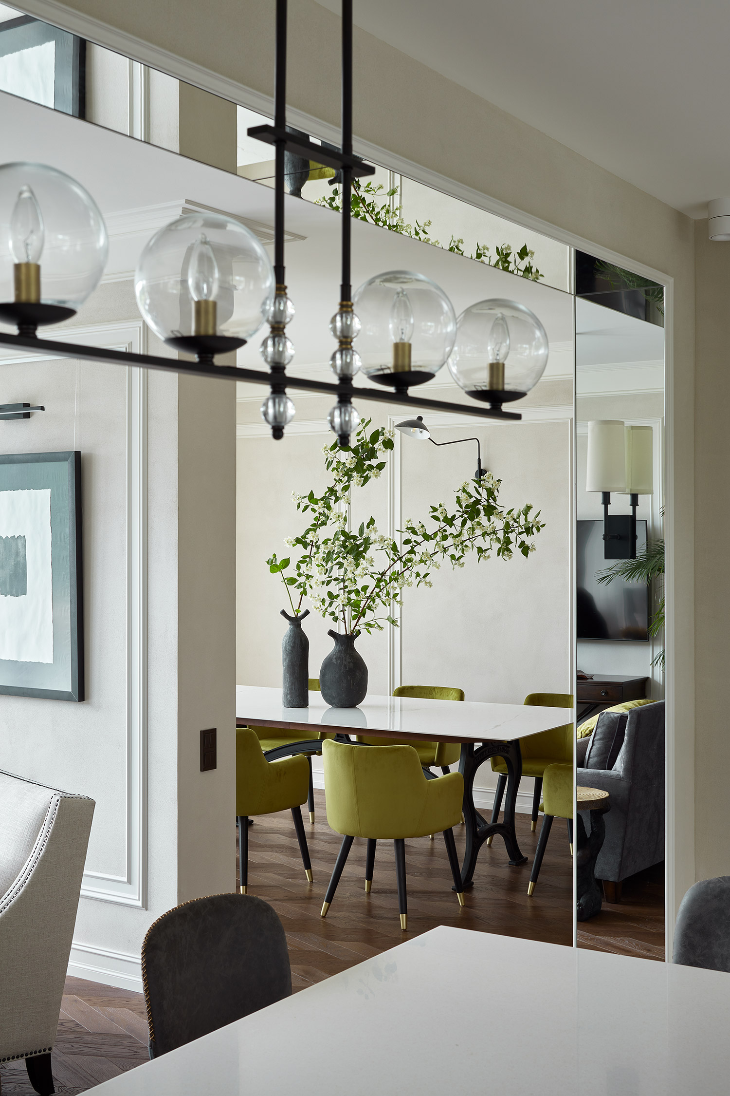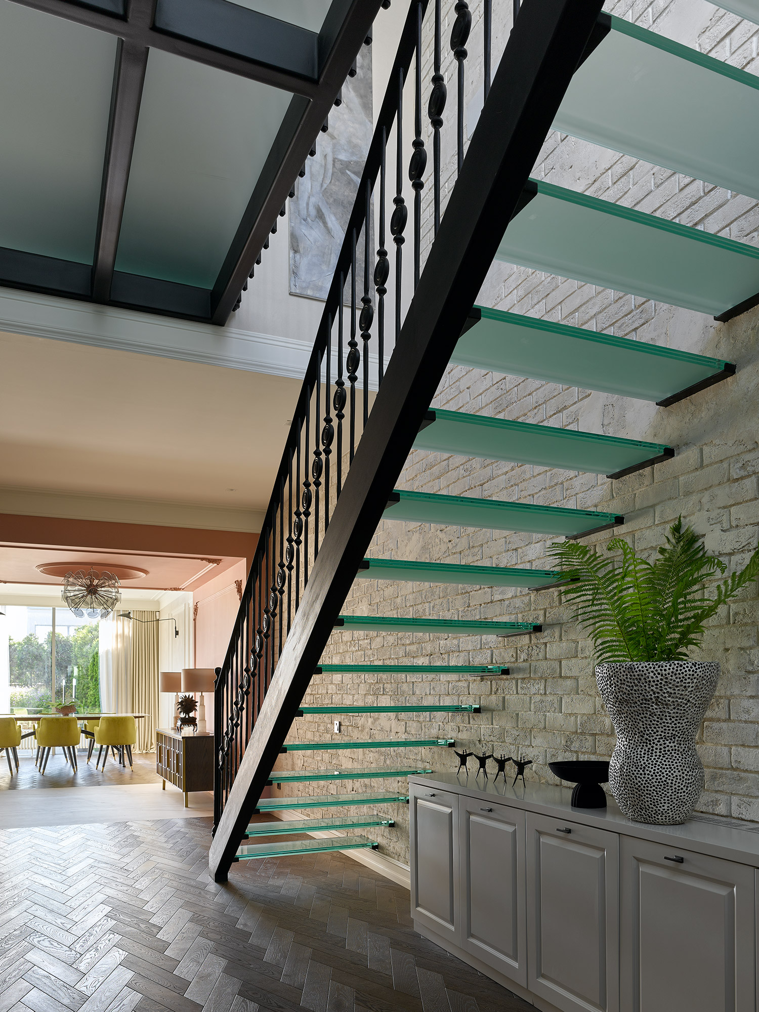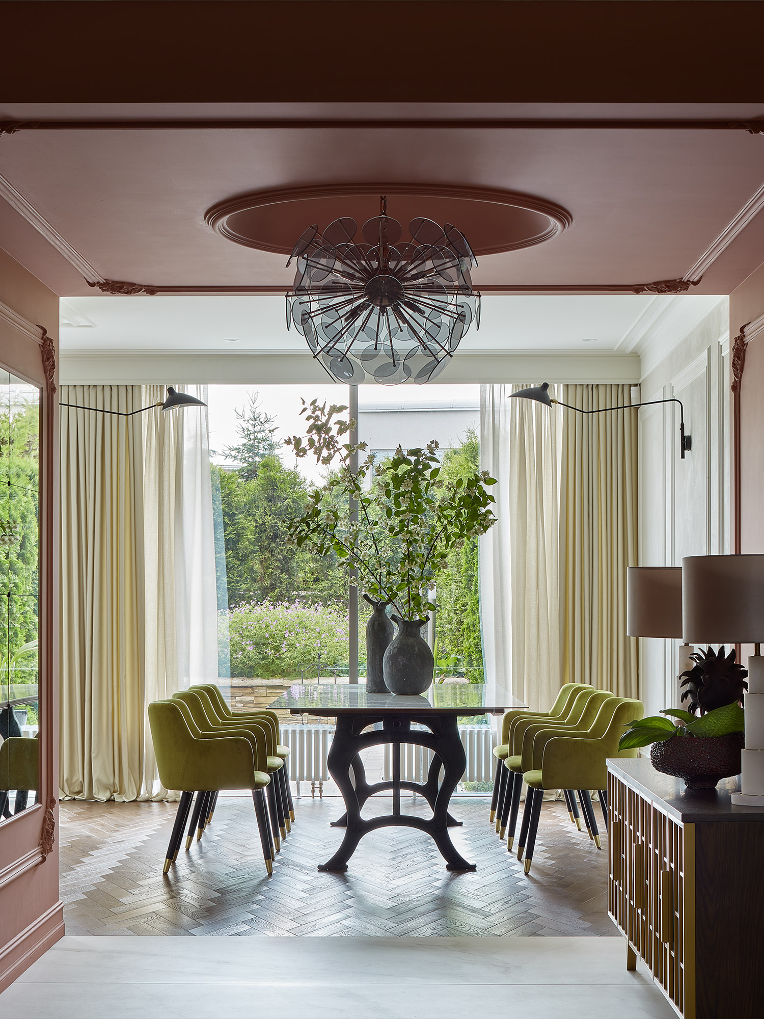 With this being our third project with the clients, collaboration was effortless. Our bold design proposals were met with immediate enthusiasm, including the unconventional choice of gorilla-shaped tables for the living room, adding a whimsical touch to the modern classic aesthetic. We transformed part of the entrance hall into a 'pink cube,' housing a striking glass chandelier that serves as a captivating art installation. Resembling the structure of a COVID-19 molecule, each 'beam' of the chandelier terminates with a delicately suspended glass plate, emitting a gentle tinkling sound upon slightest movement.