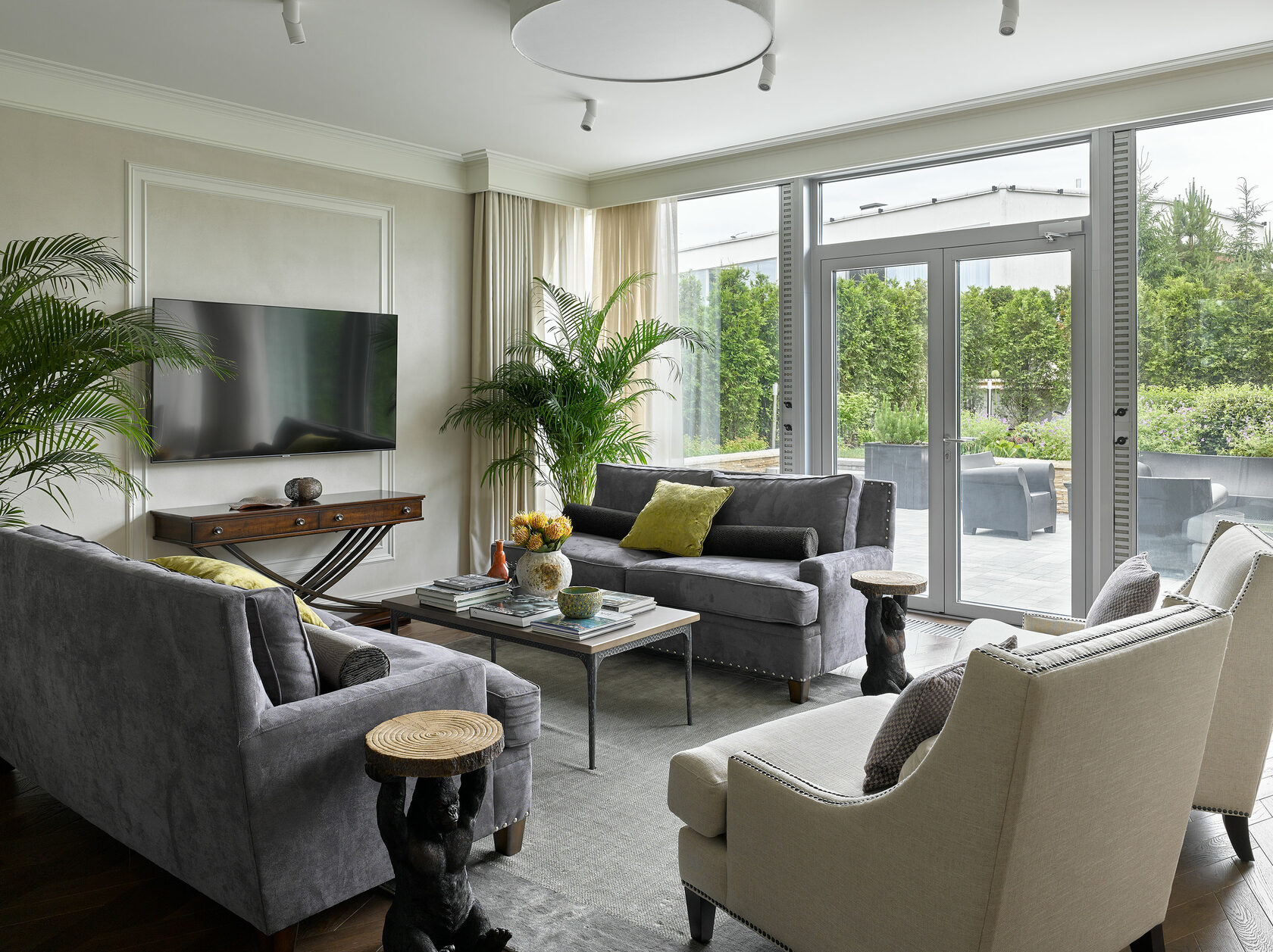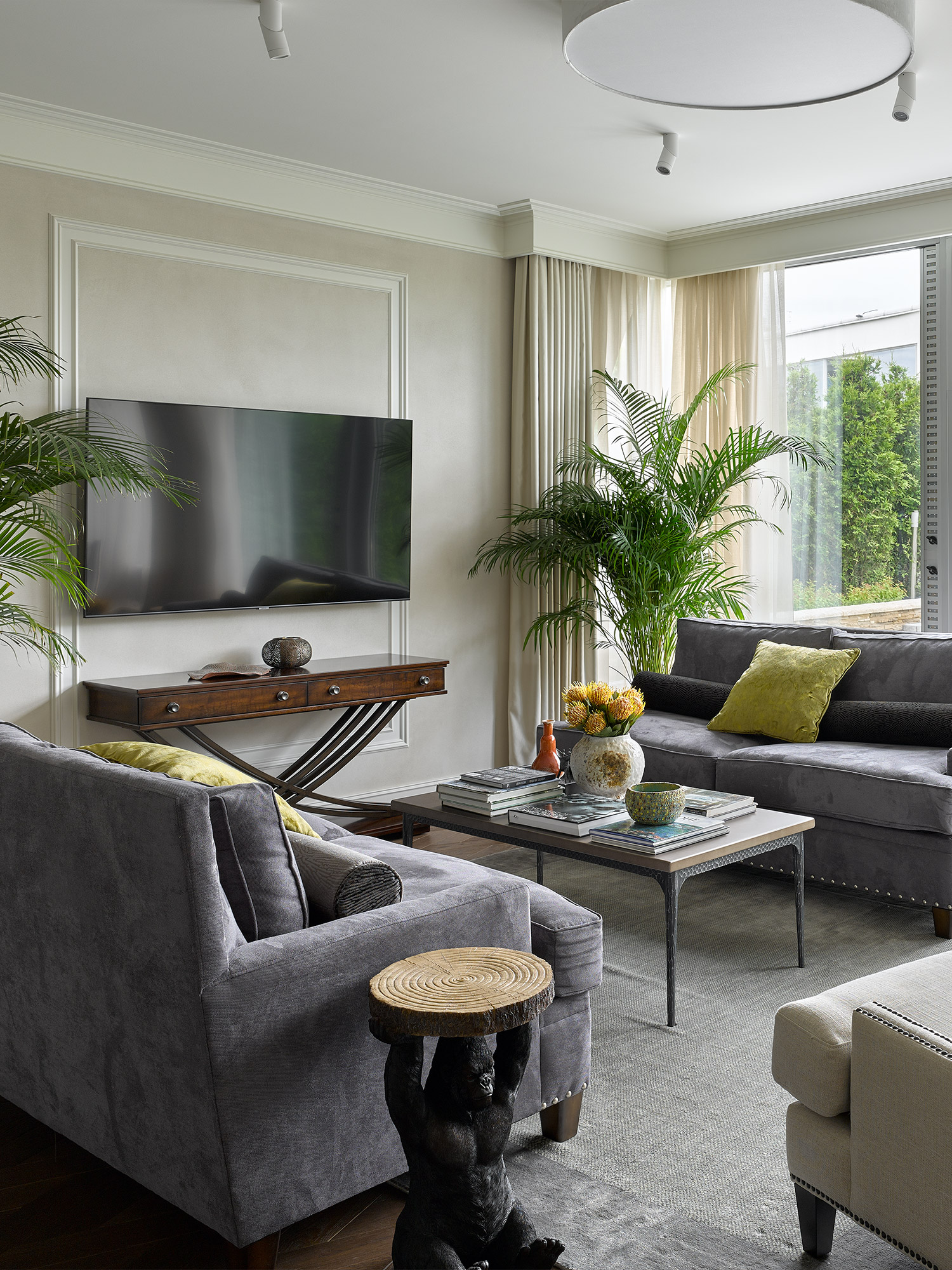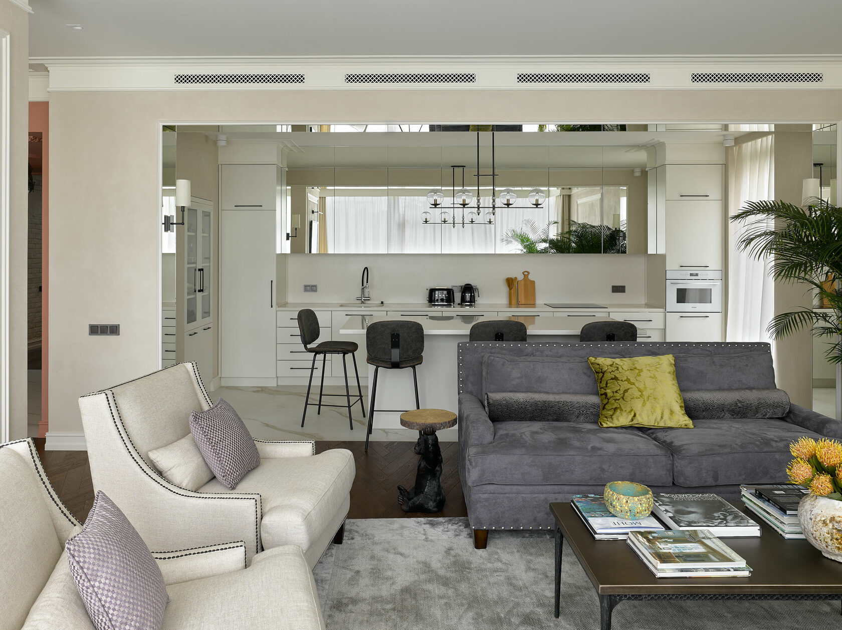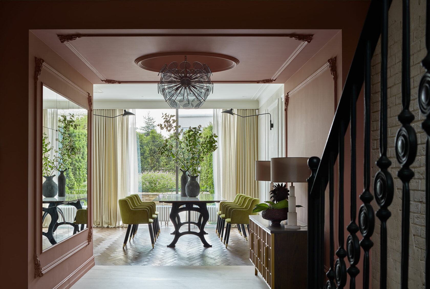 With this being our third project with the clients, collaboration was effortless. Our bold design proposals were met with immediate enthusiasm, including the unconventional choice of gorilla-shaped tables for the living room, adding a whimsical touch to the modern classic aesthetic. We transformed part of the entrance hall into a 'pink cube,' housing a striking glass chandelier that serves as a captivating art installation. Resembling the structure of a COVID-19 molecule, each 'beam' of the chandelier terminates with a delicately suspended glass plate, emitting a gentle tinkling sound upon slightest movement.
