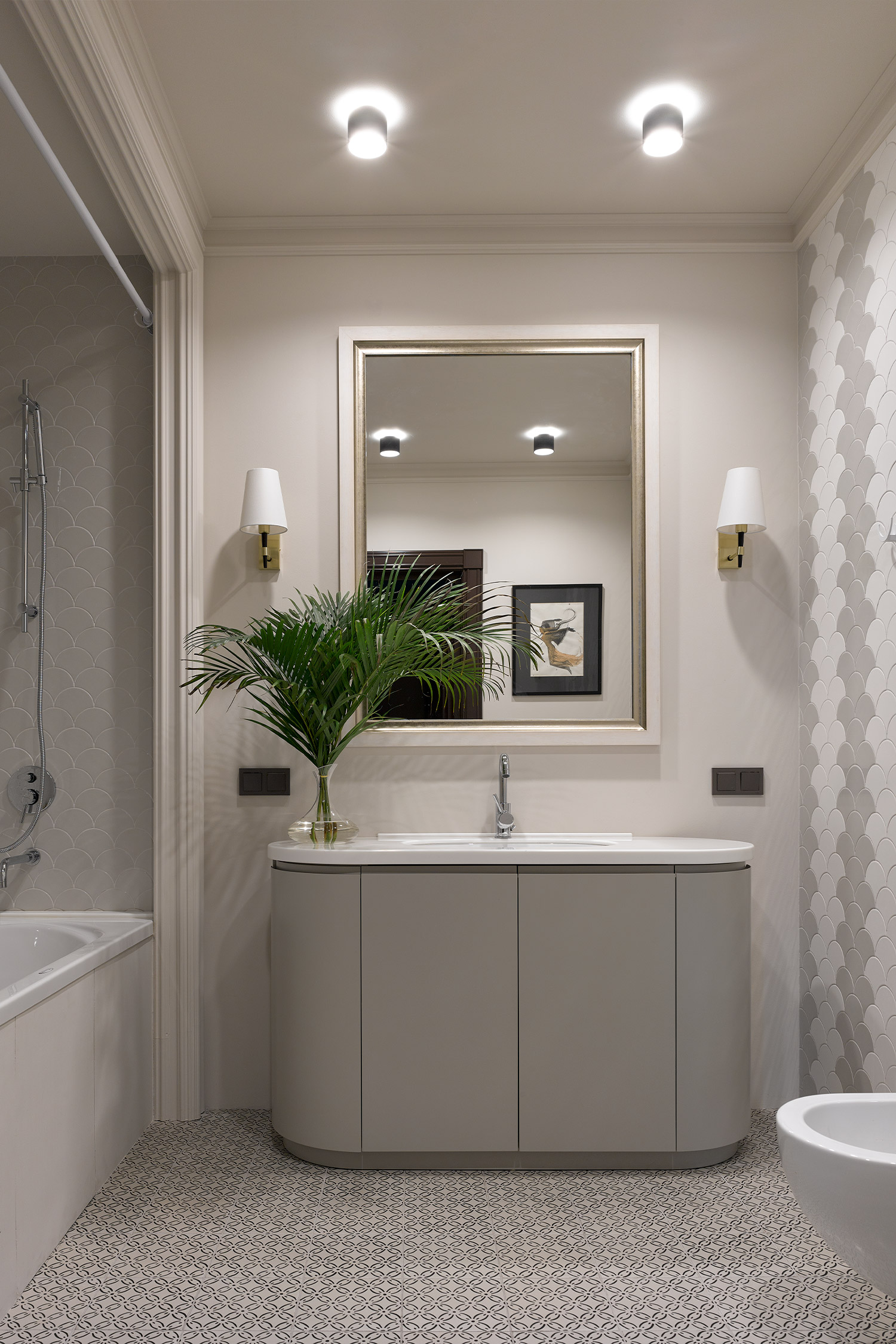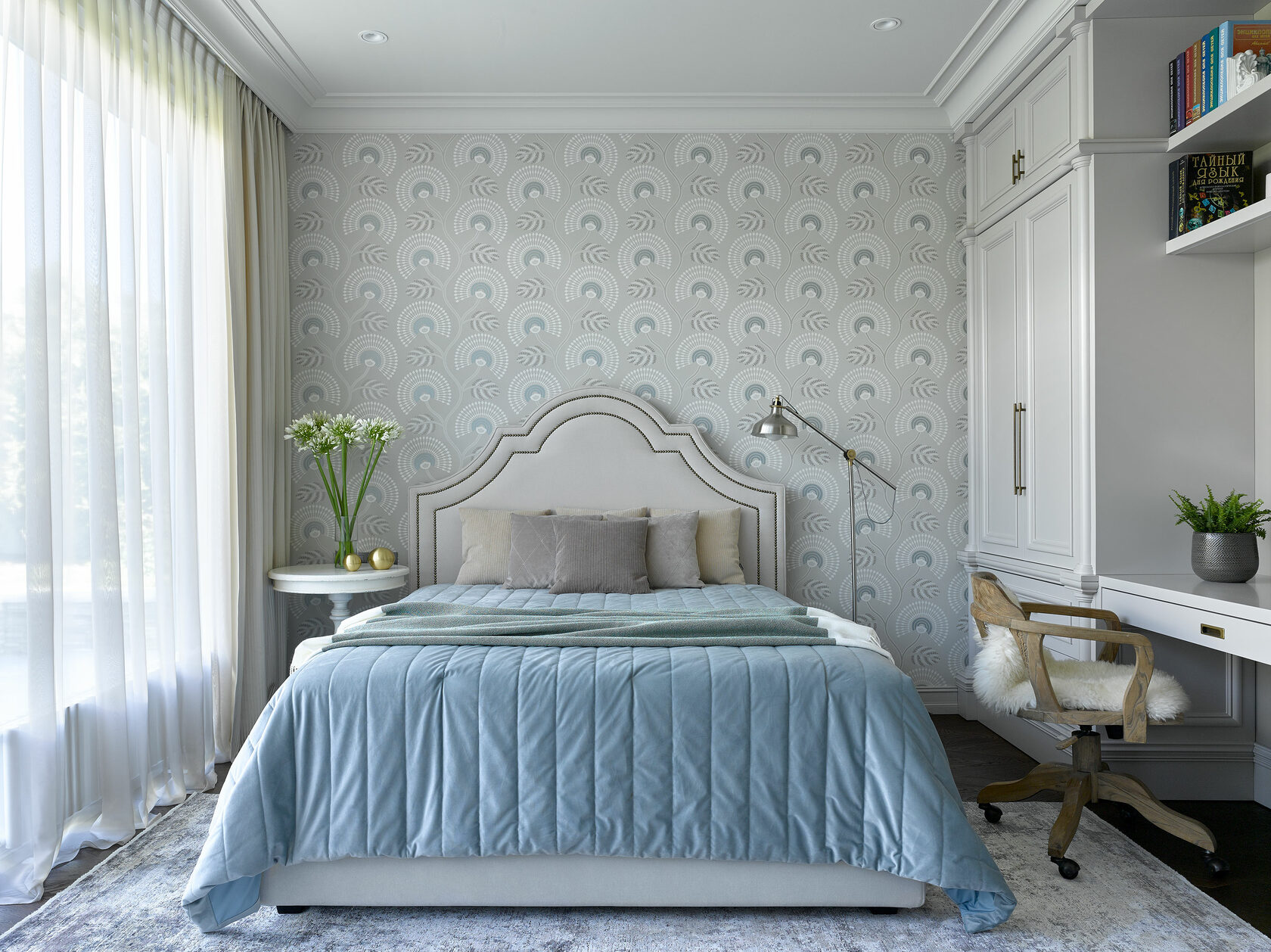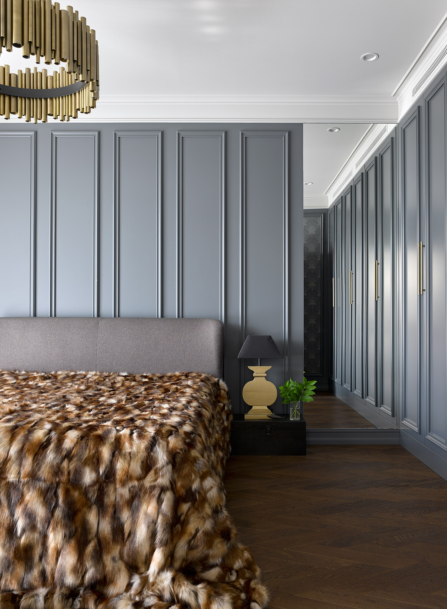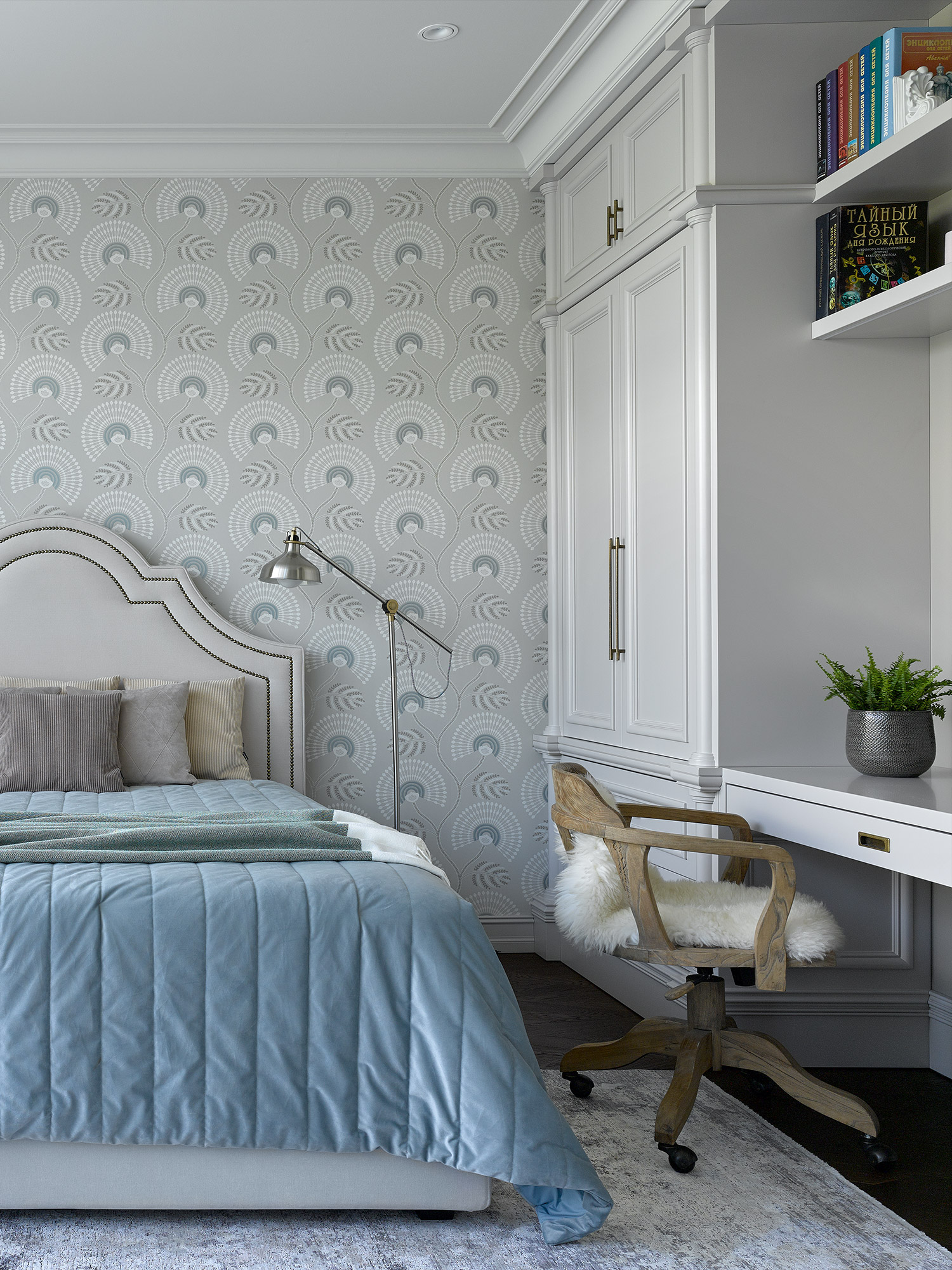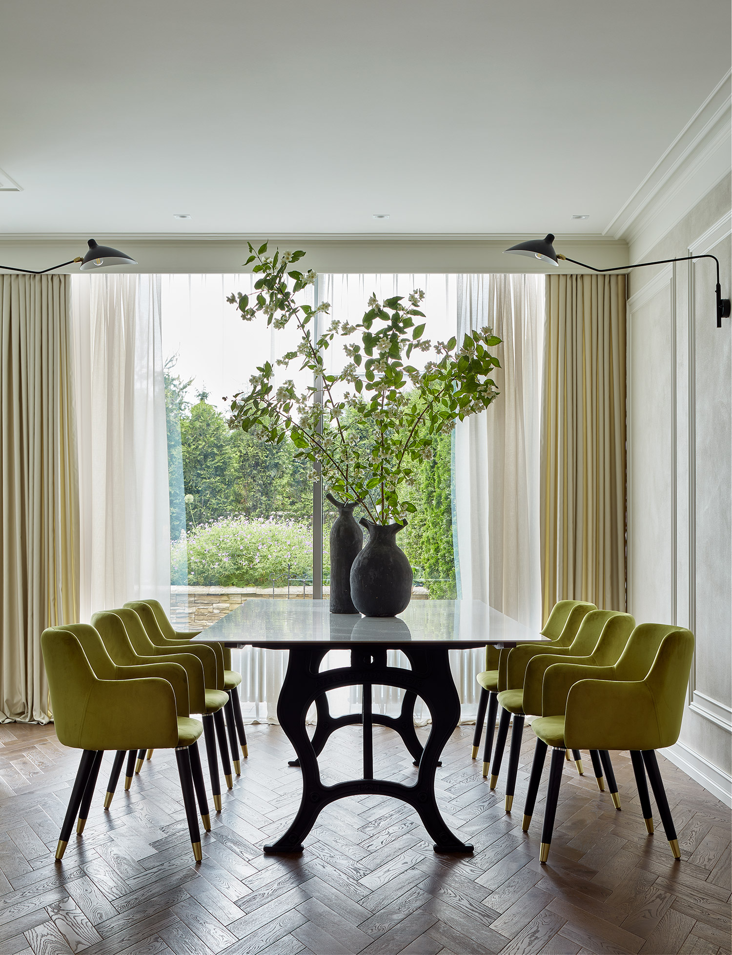 Each bedroom is meticulously tailored to suit the individual preferences of every family member. The master bedroom on the first floor boasts a sophisticated palette of dark shades and opulent textures, enhanced by a strategically placed mirror that amplifies the sense of space. The children’s bedrooms exude a softer ambiance, adorned with botanical motifs. Designed with versatility in mind, these rooms can seamlessly transition into adolescence with their restrained yet noble aesthetic.