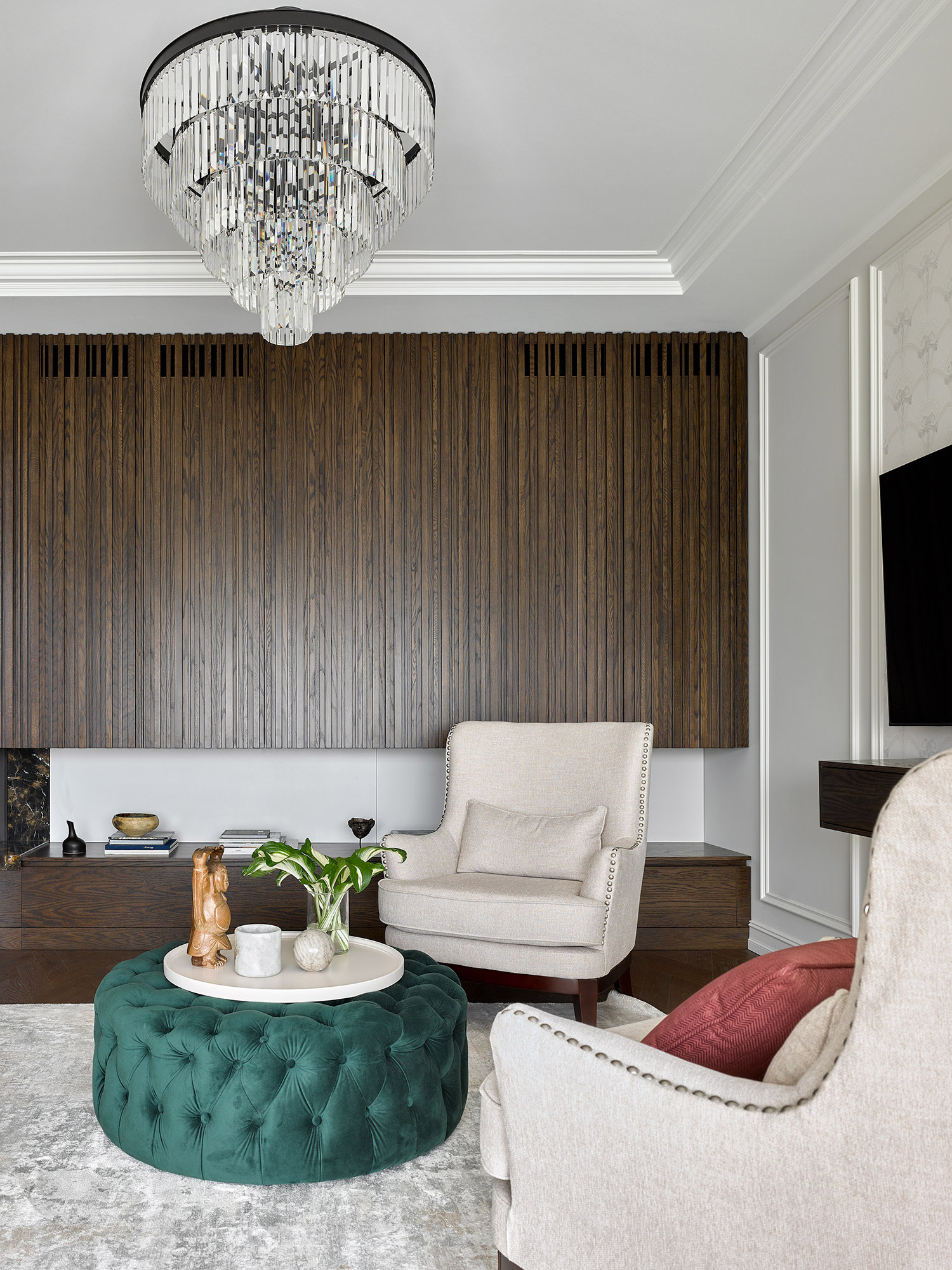 A chic chandelier turns an austere living room into a boudoir