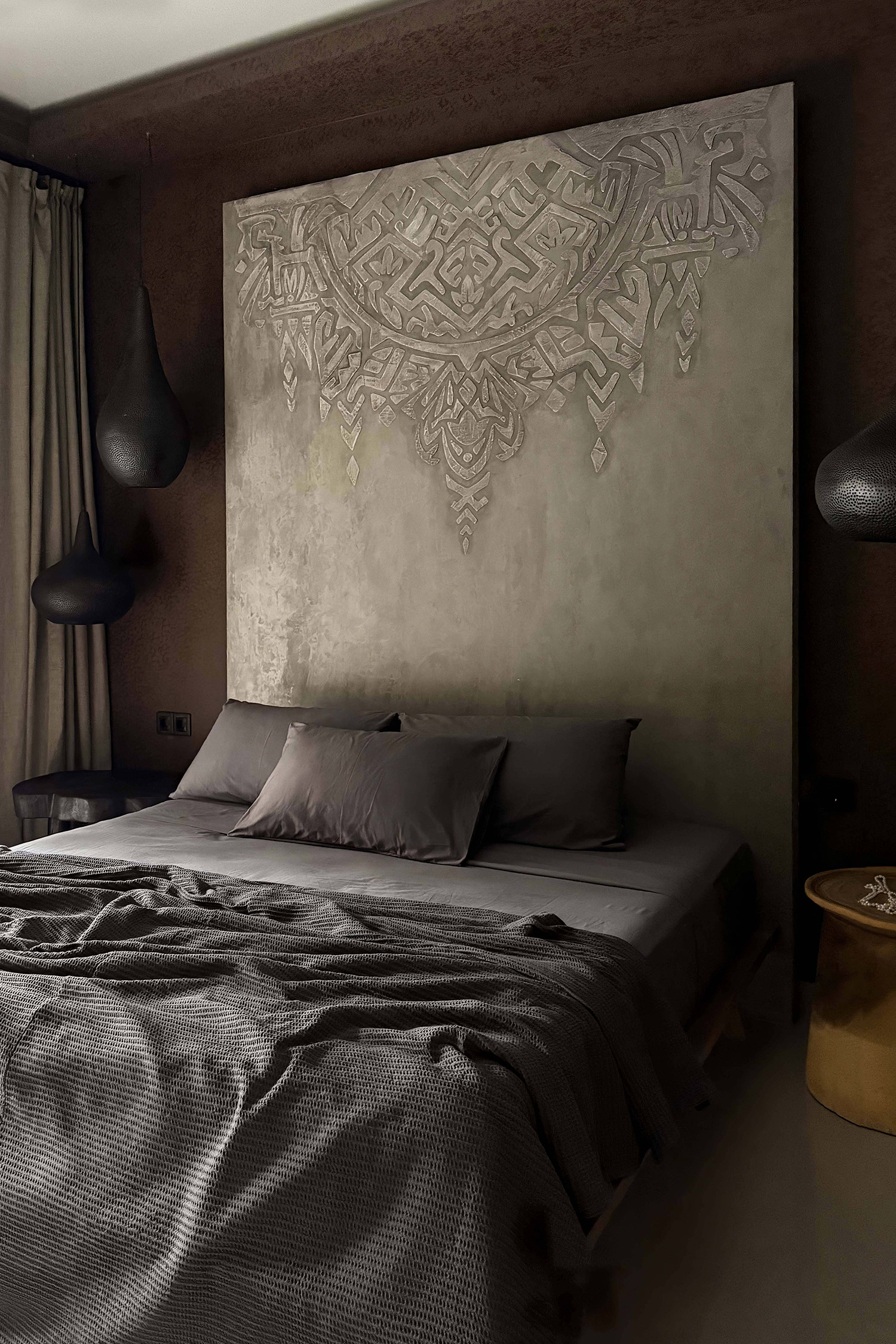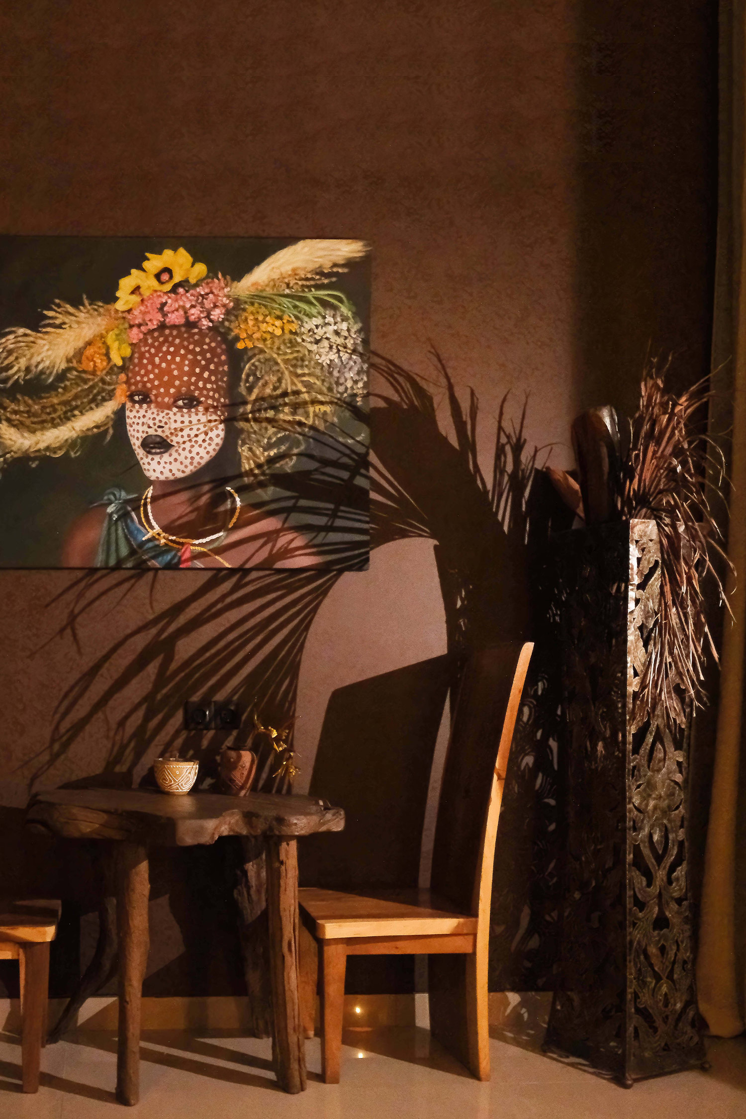The distinctive patterns on the bedroom walls bring a sense of wild nature into the interior. The tall headboard is hand-painted by Russian artists in traditional Balinese motifs and represents a unique design concept. The bedrooms are furnished with natural wood tables, include chests of drawers for storage, and feature small wardrobe areas.