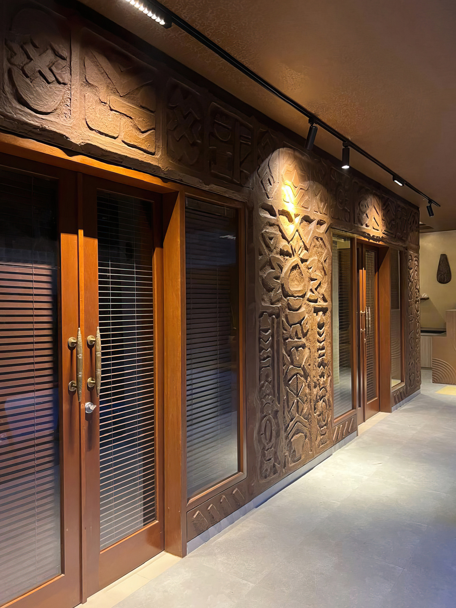 Hand-carved woodwork expressing the unity of nature, animals, and humans. A unique artifact that adds depth and a philosophical layer to the space