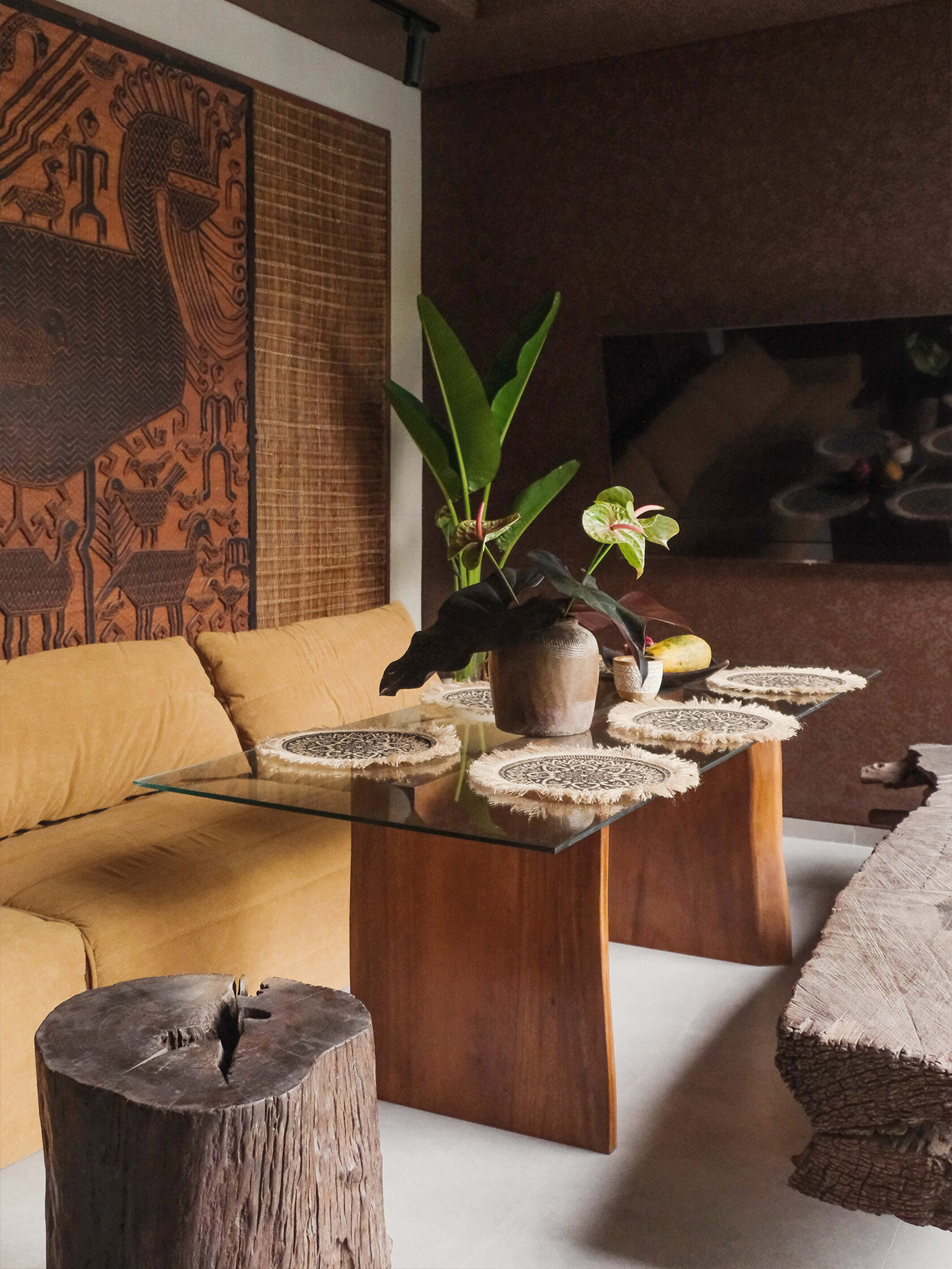 Designed and crafted in Bali exclusively for this project. The glass tabletop allows the space to breathe, while the wooden base seamlessly connects all the natural wood elements throughout the interior