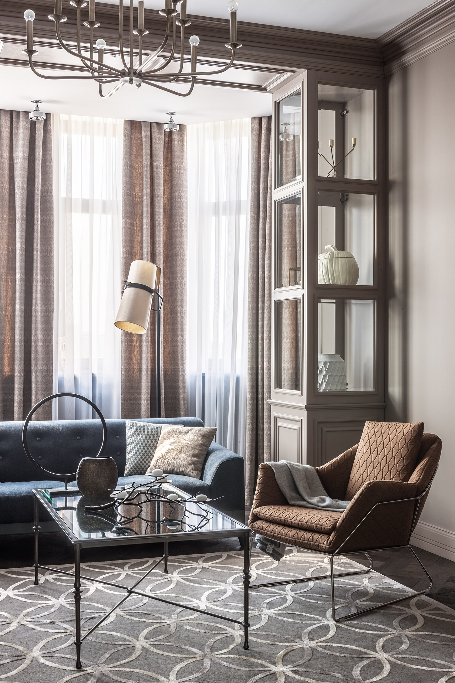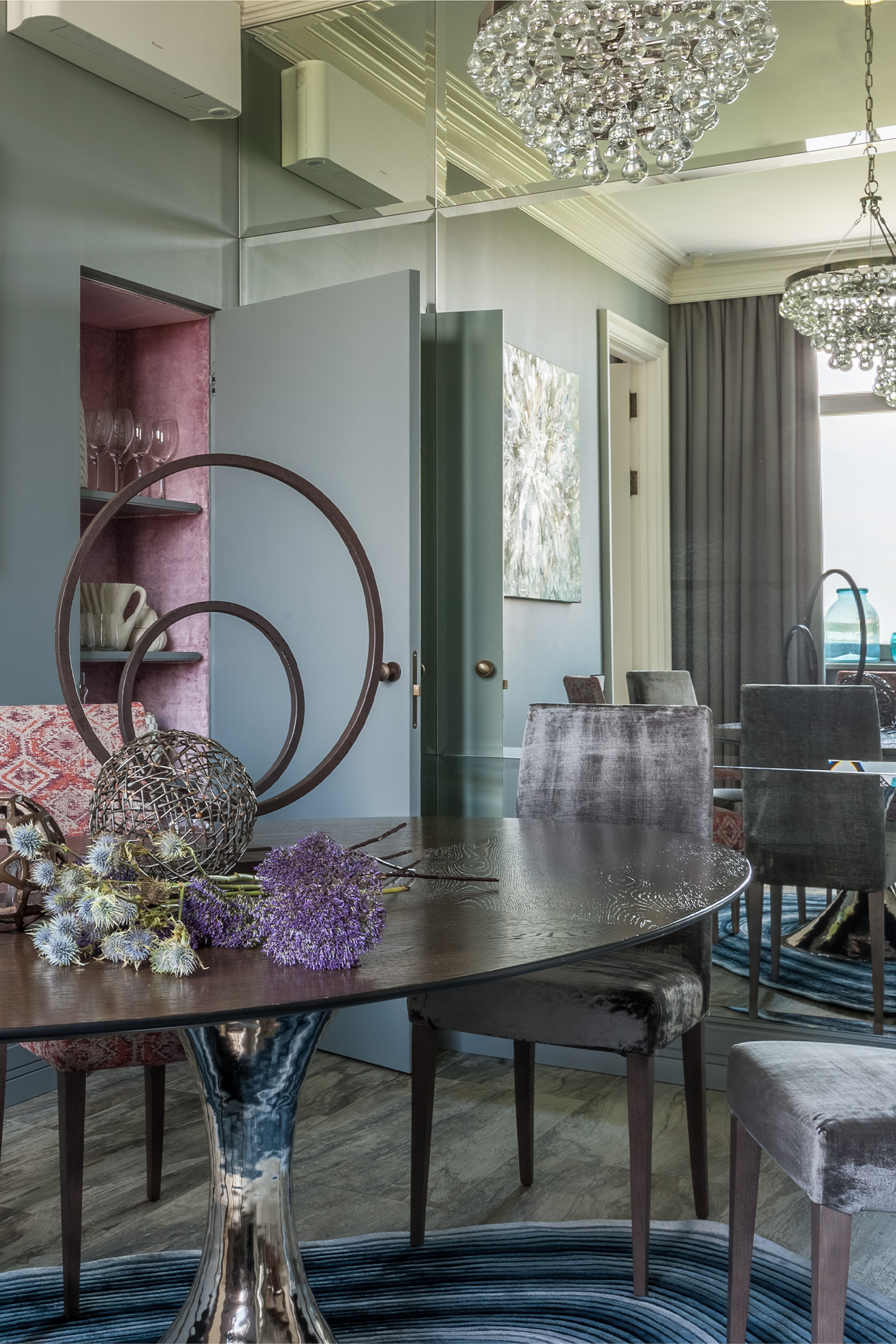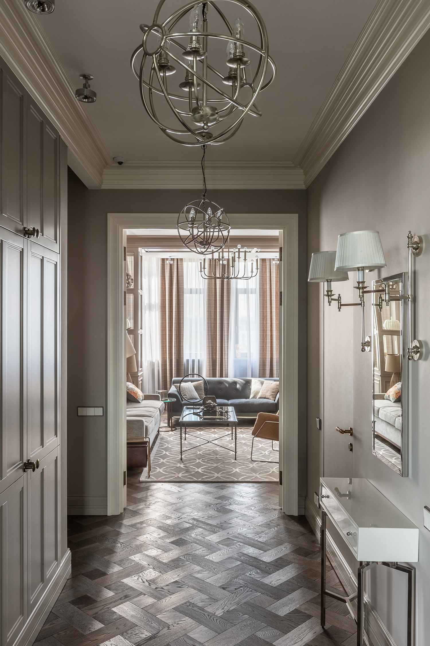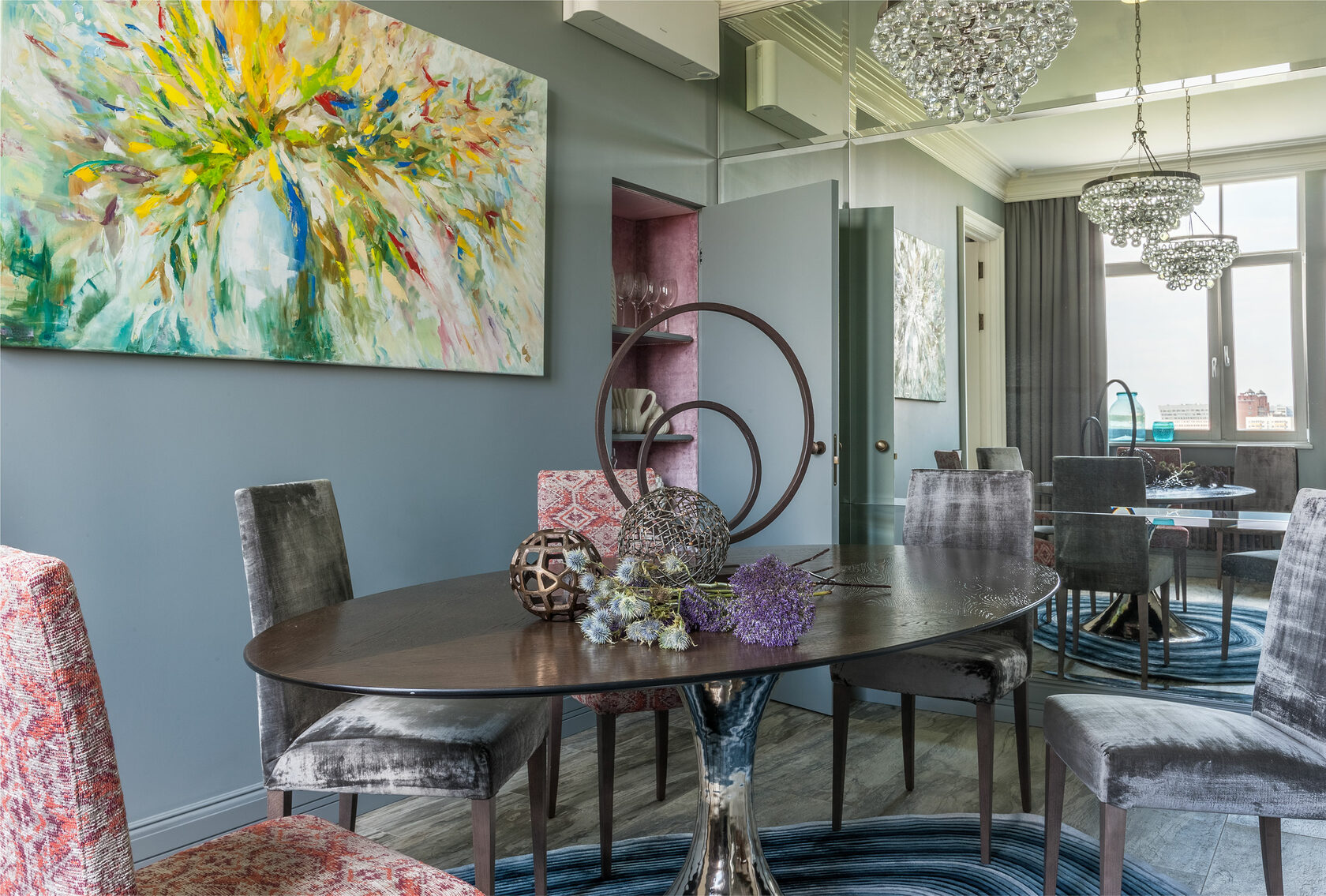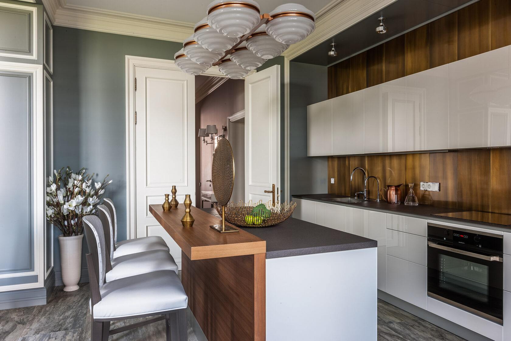 We successfully crafted a well-thought-out layout featuring enfilade elements, capitalizing on the blank canvas provided by the unfinished 150 m² apartment in a Moscow new building. The kitchen-dining room, hall, and living room align seamlessly on a central axis. Establishing rapport with the client was effortless, as we shared a mutual understanding that functionality should complement, not compromise, design. Incorporating classic elements like moldings and cornices added a touch of elegance to the modern aesthetic.
