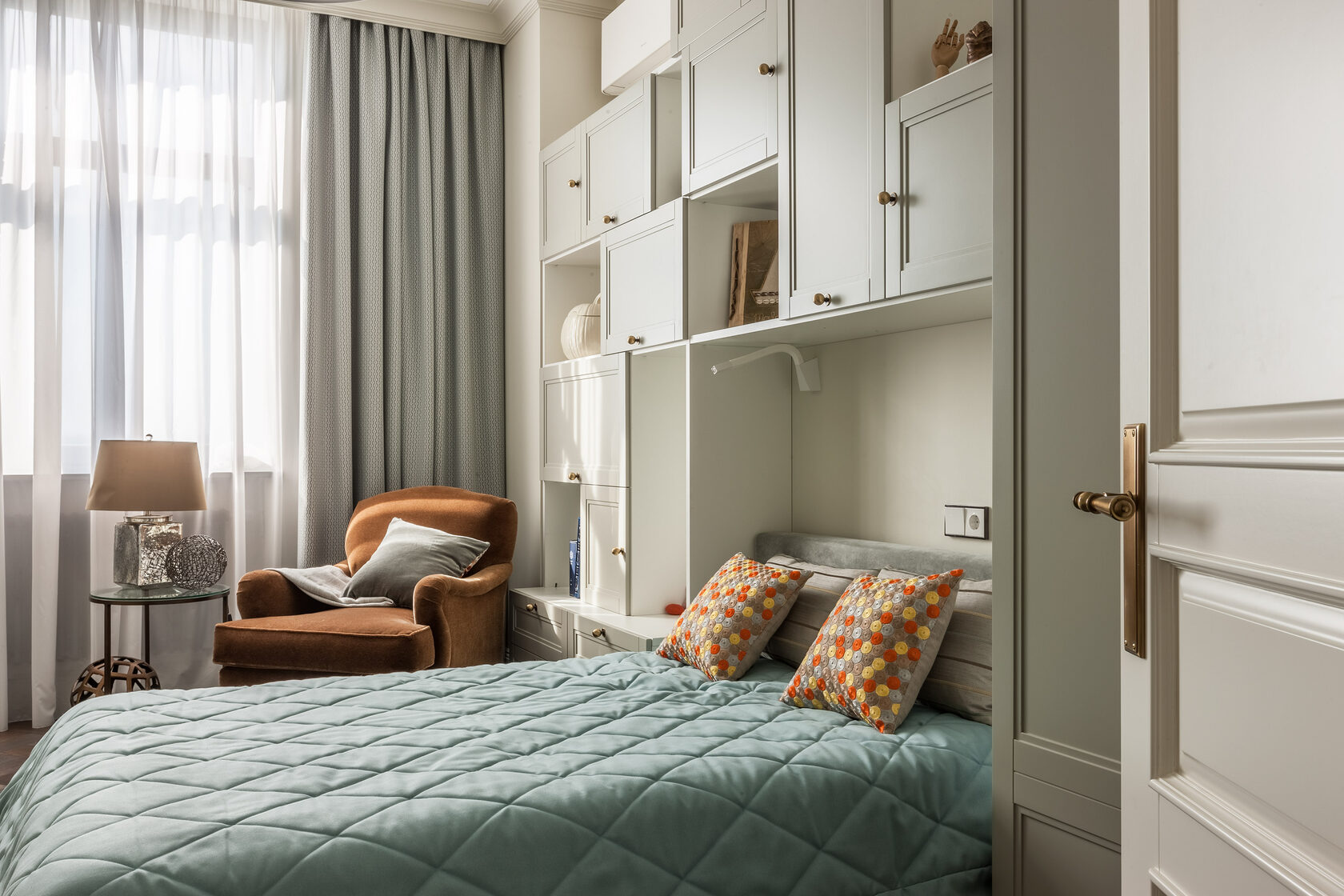 Zoning the space received meticulous attention, and we executed our vision using portals strategically placed throughout the apartment. One such portal connects the dining room and kitchen, while another, fashioned as a library, graces the living room. A corridor cleverly separates the bedroom from the front portion of the apartment.