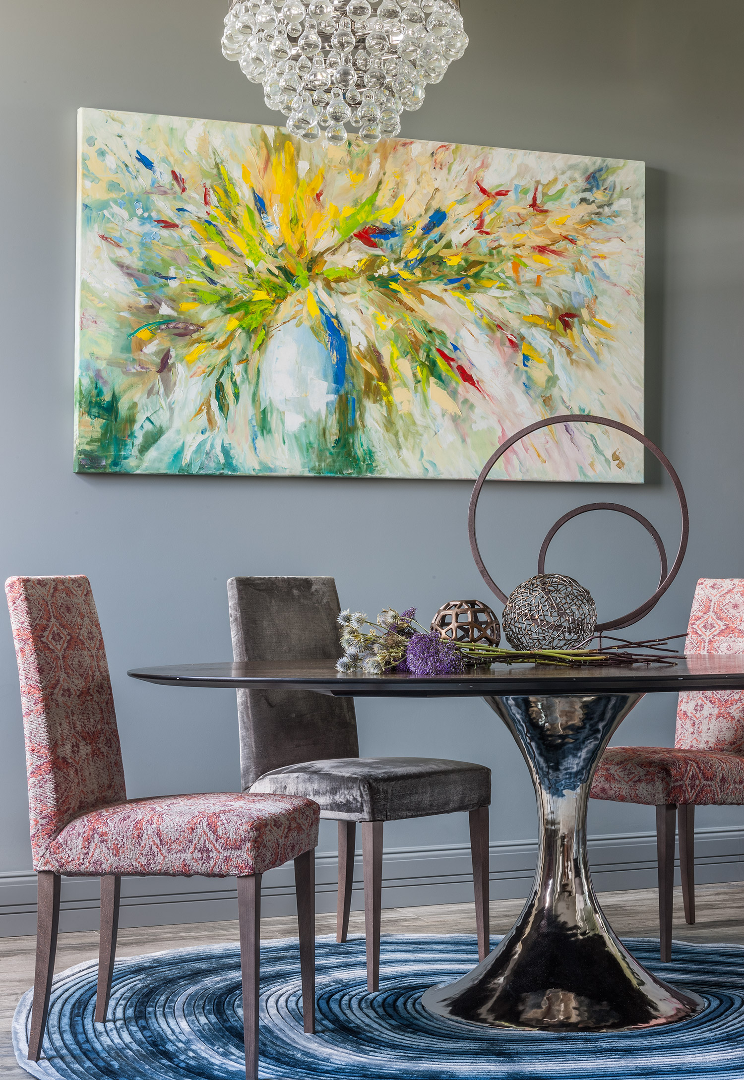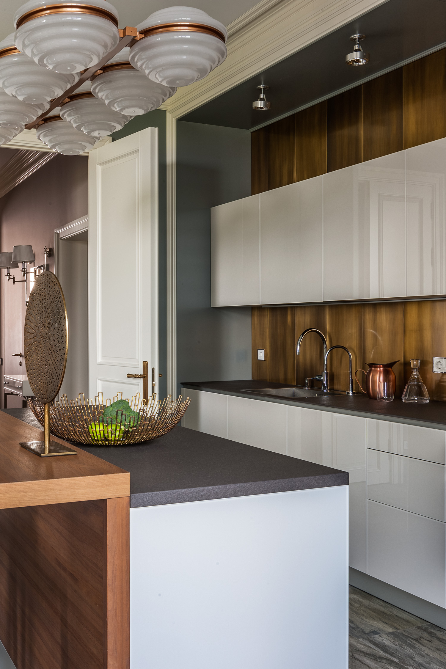 We incorporated an array of metal accents, from lamp frames to table bases and lacquered brass panels, lending a distinctive touch to the design. The brass panels, in particular, served as an ideal backdrop for the sleek white fronts of the kitchen, resulting in a truly unique aesthetic.