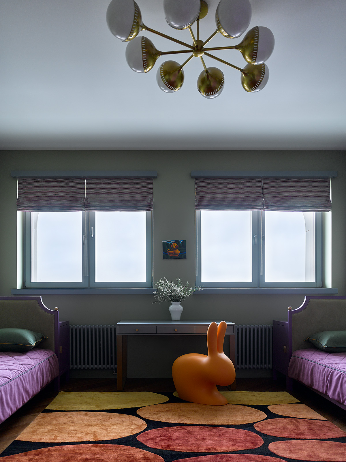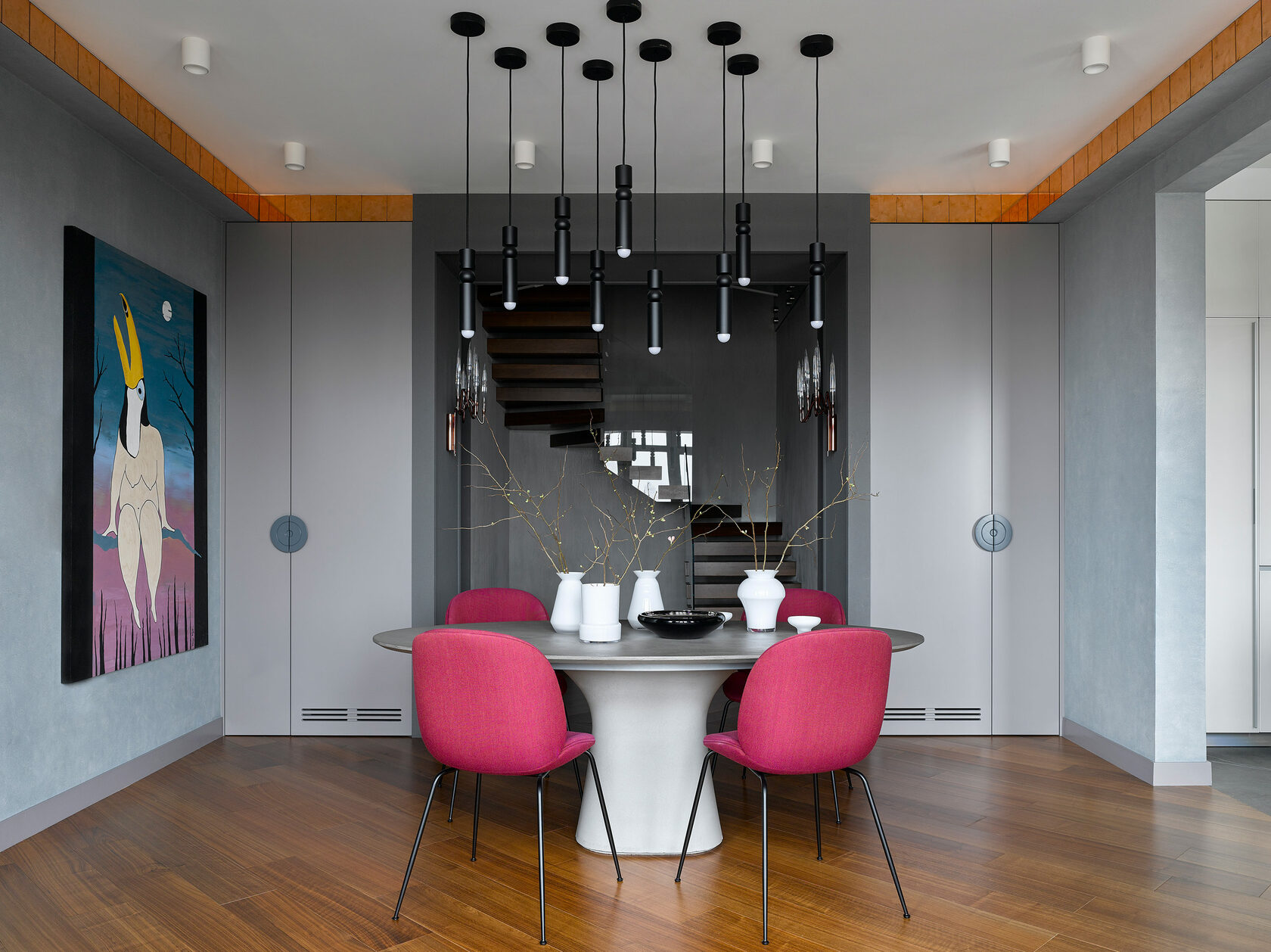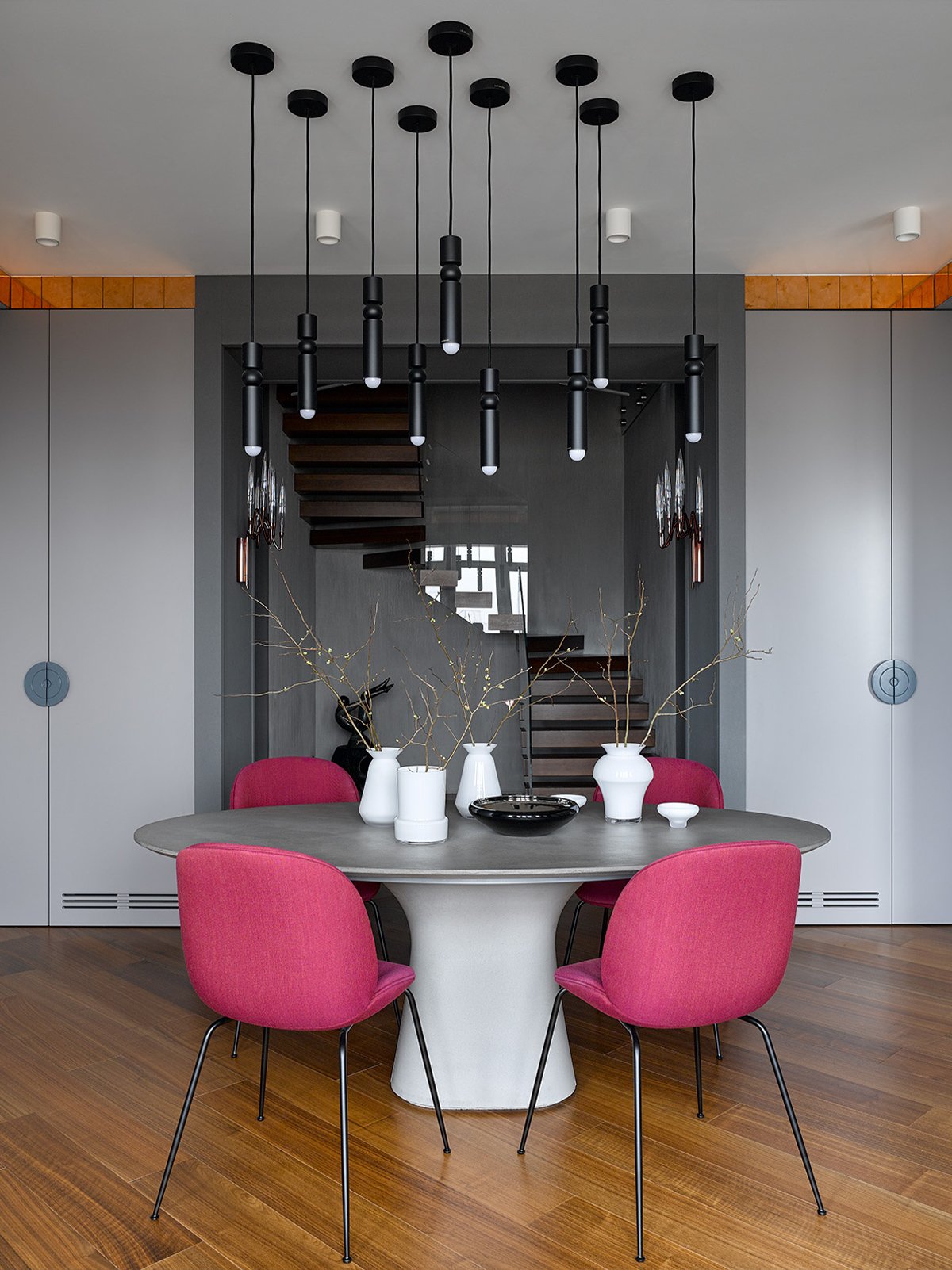 Пентхаус площадью 270 м² мы оформляли для семьи с тремя детьми. И это был уже наш второй совместный проект. В наших руках оказалось помещение со свободной планировкой, но большим количеством ограничений по переустройству некоторых конструкций. При этом перед нами стояла задача зонировать пространство так, чтобы каждый из членов семьи смог оказаться в комфортном, но изолированном личном пространстве.