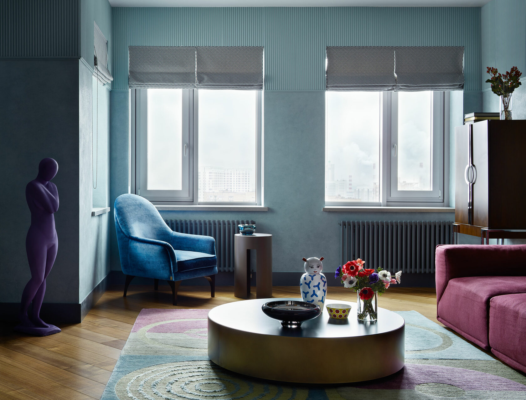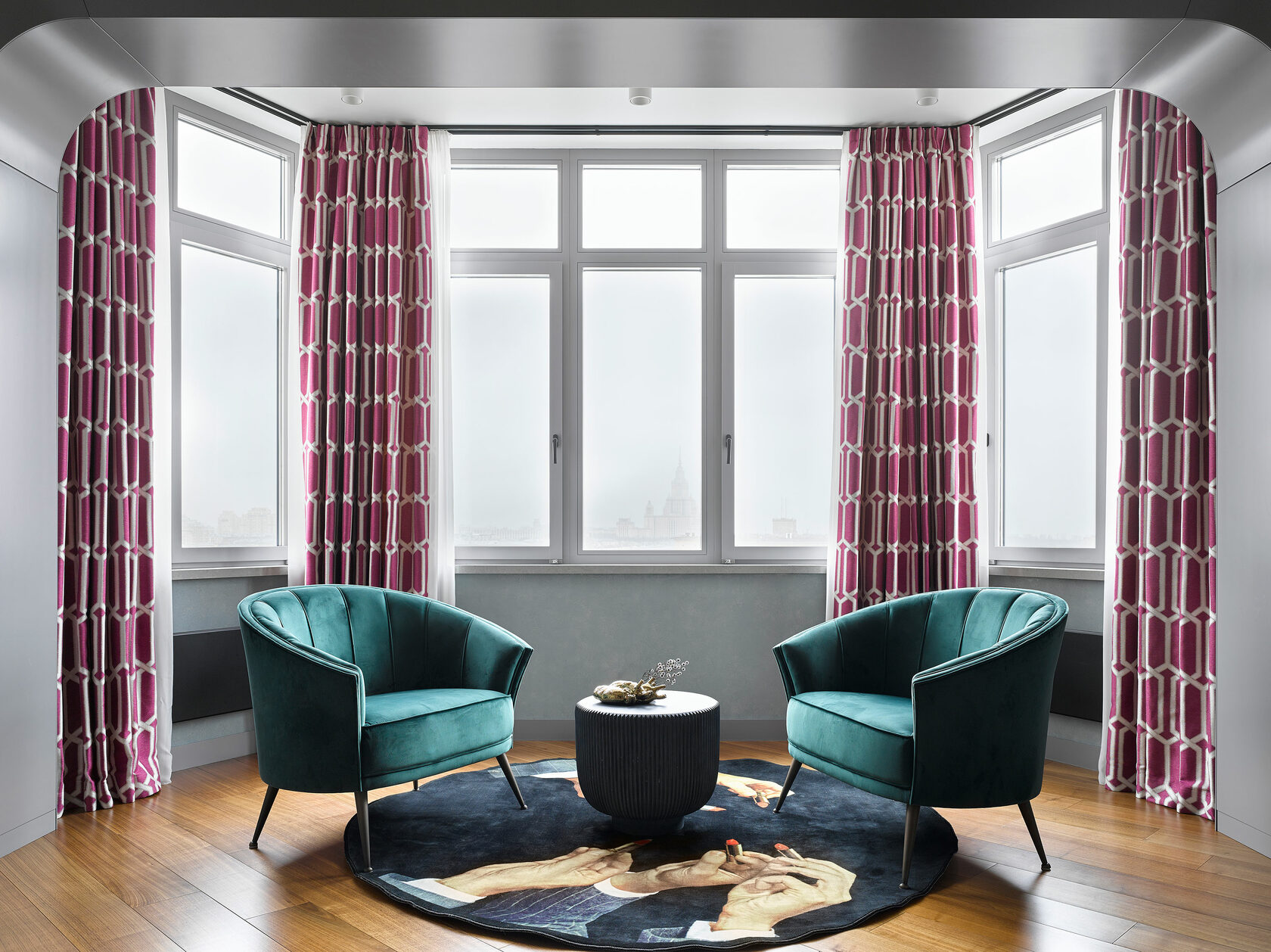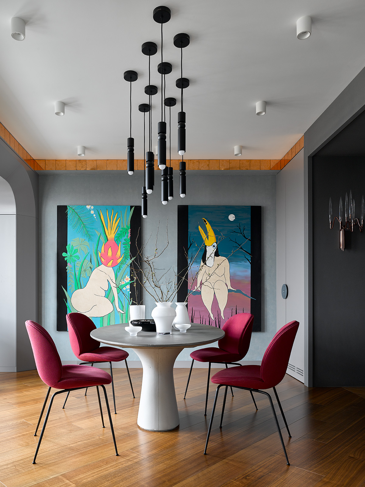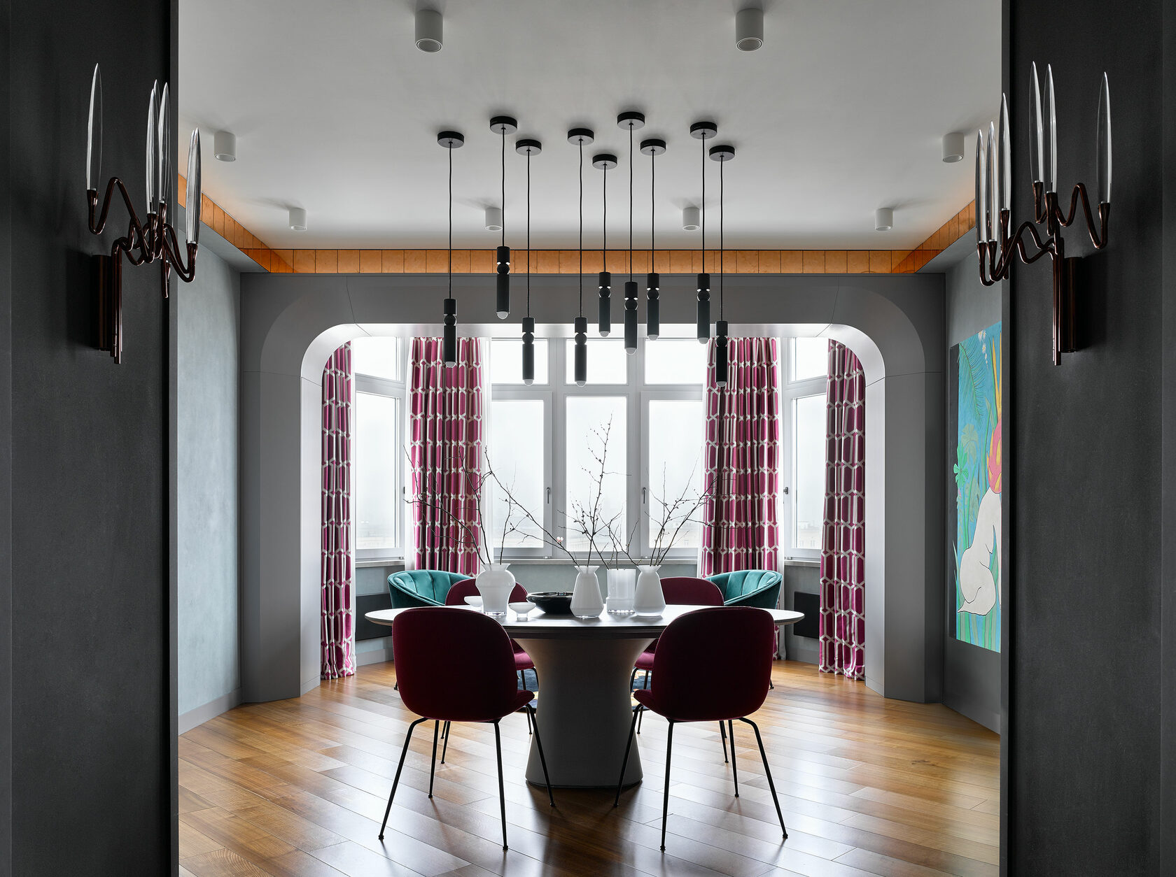 Пентхаус площадью 270 м² мы оформляли для семьи с тремя детьми. И это был уже наш второй совместный проект. В наших руках оказалось помещение со свободной планировкой, но большим количеством ограничений по переустройству некоторых конструкций. При этом перед нами стояла задача зонировать пространство так, чтобы каждый из членов семьи смог оказаться в комфортном, но изолированном личном пространстве.