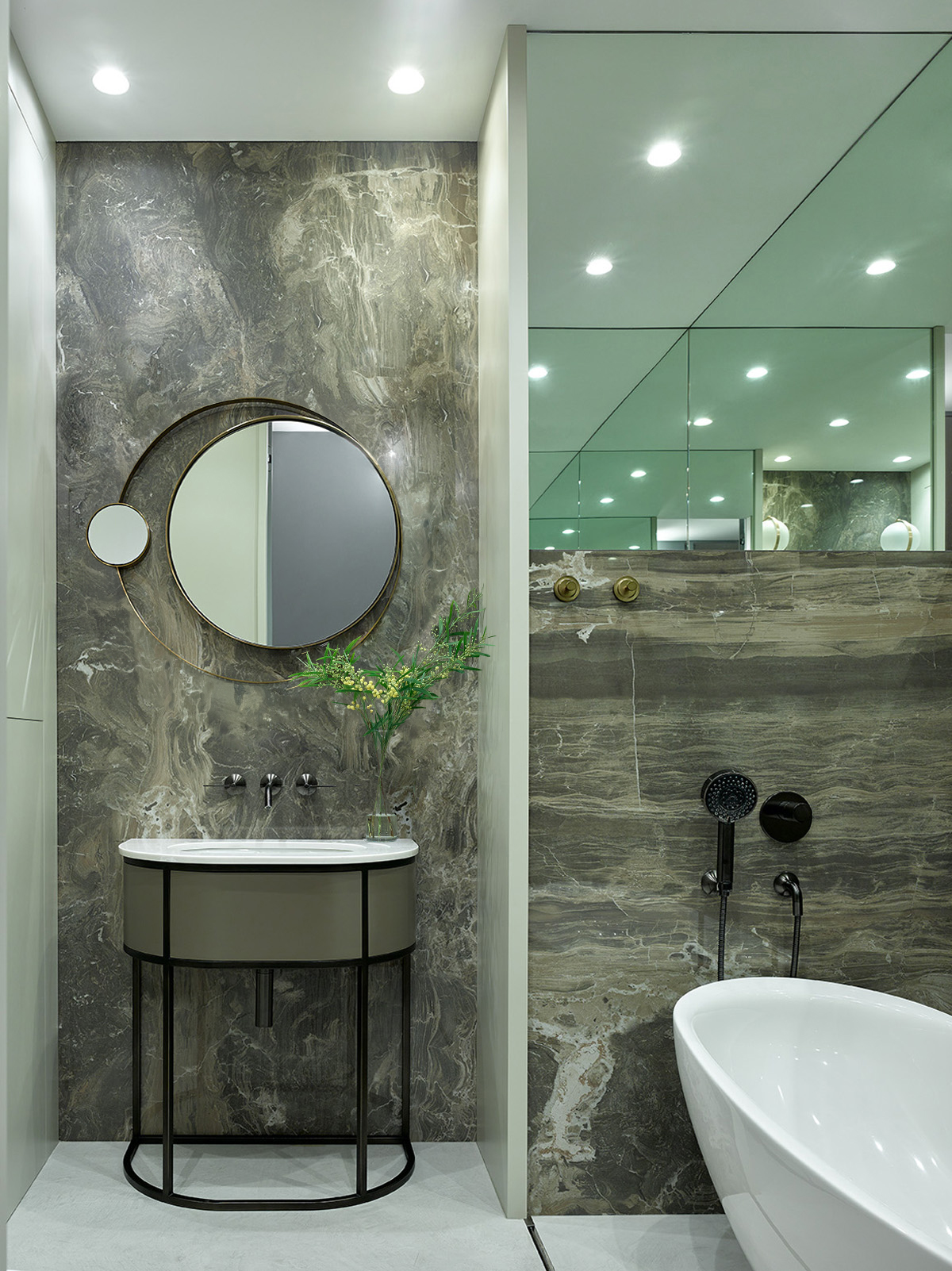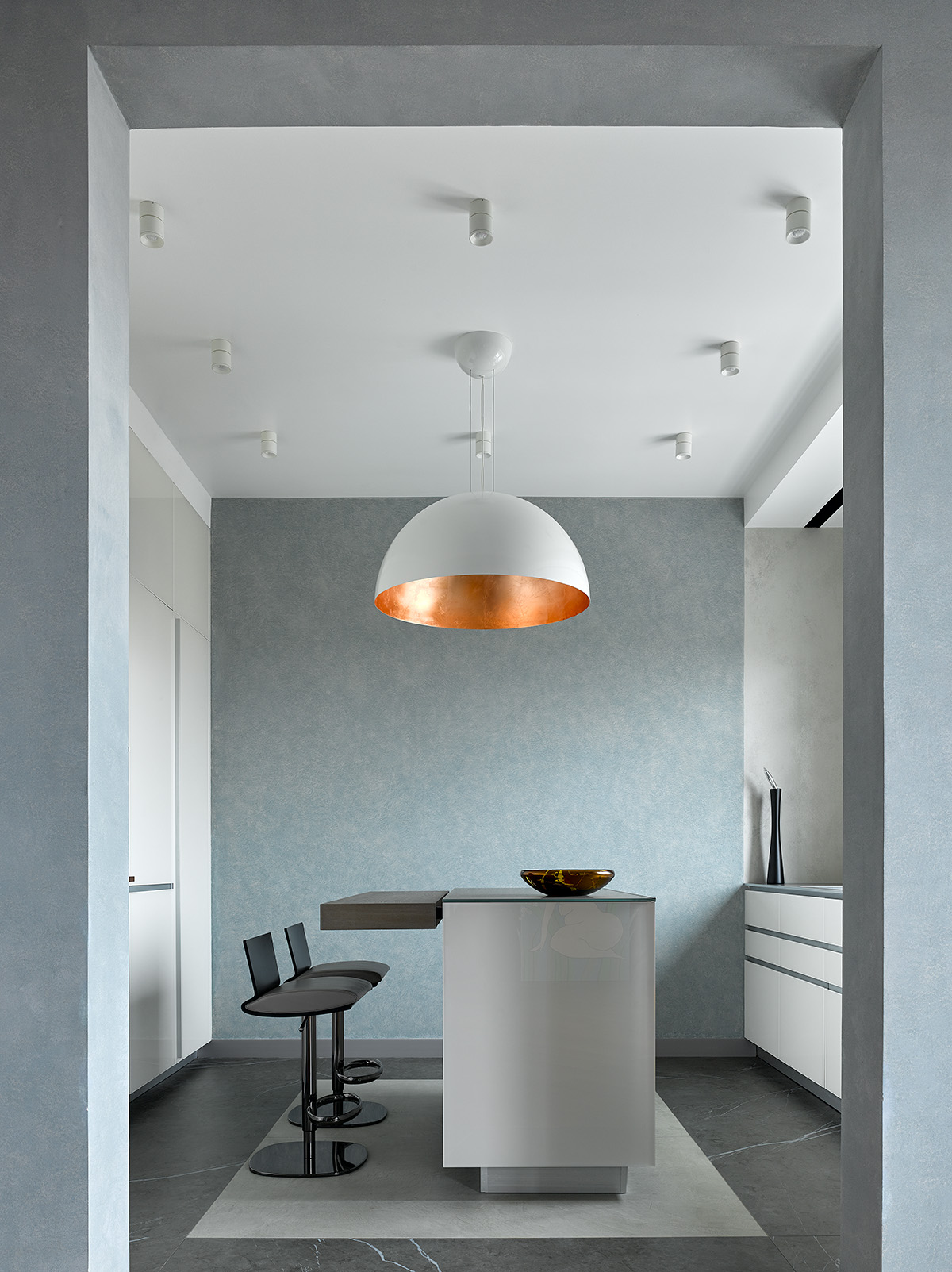 В оформлении интерьера мы использовали натуральные материалы — дерево, металл, гипс. На полу — американский орех. К нему мы подбирали материалы и краски в мебели и стенах. Интересно было также ввести в интерьер медь. Еще использовали стеновые панели МДФ, крупноформатный керамогранит Arch-Skin, декоративные покрытия стен. На стенах не обои, а декоративная штукатурка. Ее можно мыть, она вандалопрочная.