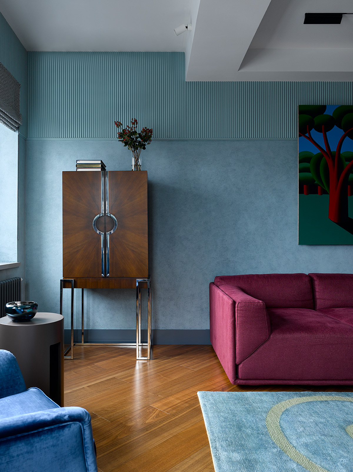 Глянцевые фасады выглядят еще наряднее на фоне голубых стен