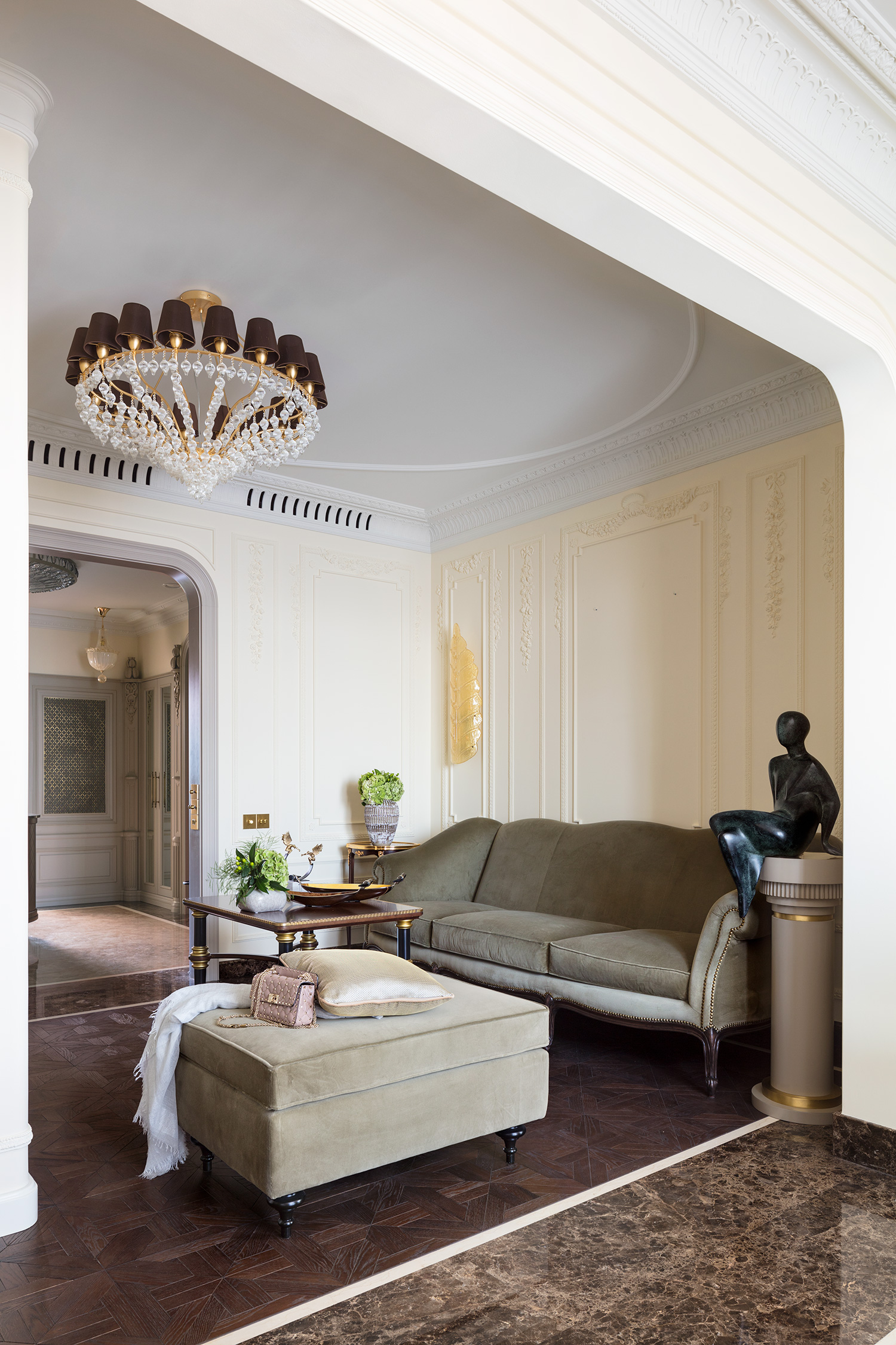 Мы использовали нейтральные оттенки с небольшими яркими акцентами и принтами в текстиле, отделке и фактурах. Растительные и животные мотивы разбавляют строгие графические орнаменты. Интерьеры почти всех комнат украшают скульптуры известных авторов со всего мира и антиквариат.